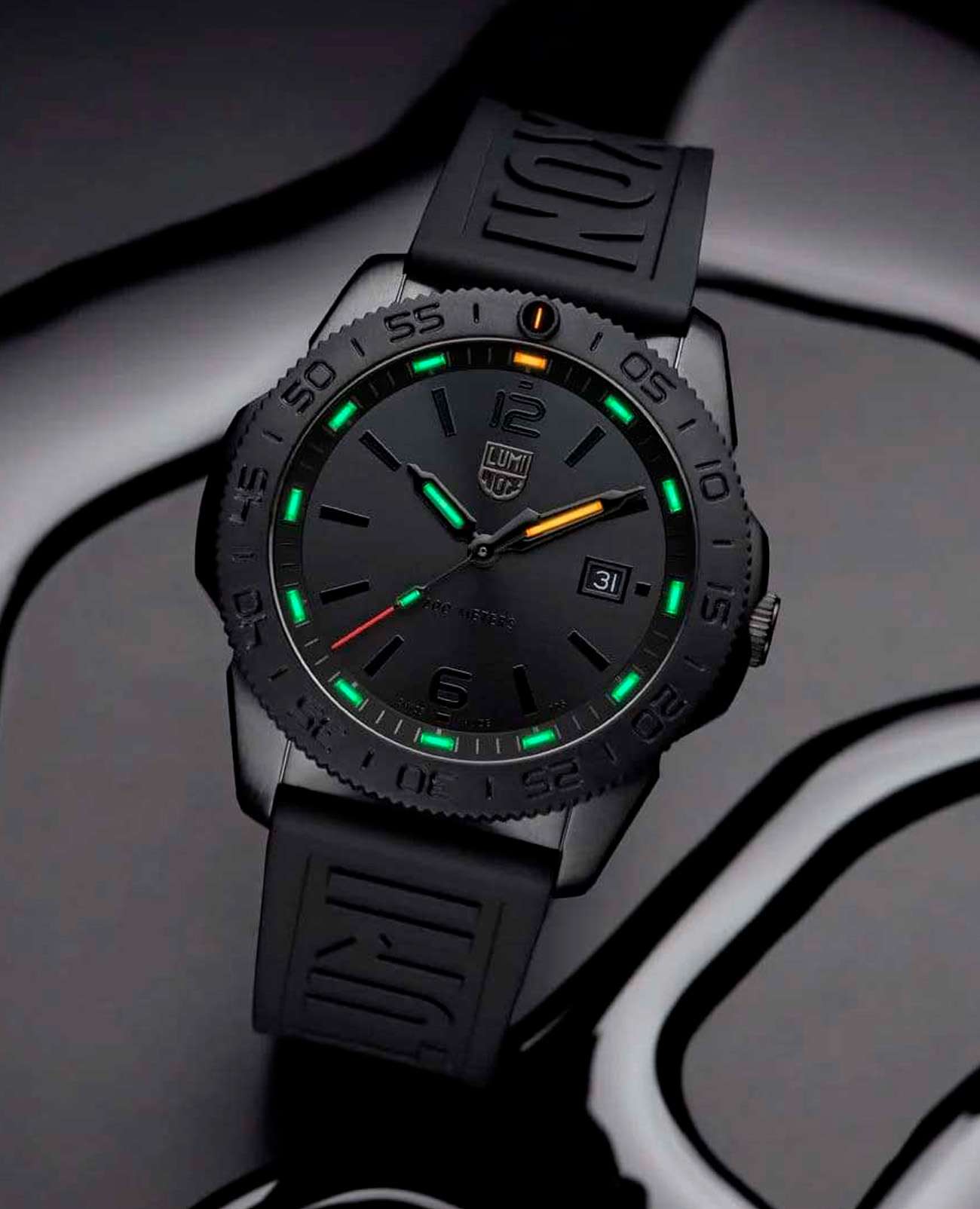 Мужские наручные часы Luminox XS.3121.BO.1 из коллекции Pacific Diver сочетают в себе спортивный дизайн и надежность швейцарского качества . Модель обладает круглым корпусом диаметром 44 мм, изготовленным из нержавеющей стали с PVD-покрытиемPVDУльтратонкое покрытие наносится в технике вакуумного напыления, сочетает в себе нитрид титана особой прочности со слоем золота или оксида хрома. Несёт в себе декоративную или защитную функцию., что обеспечивает высокую устойчивость к внешним воздействиям и долговечность . Циферблат черного цвета украшен контрастными метками и стрелками с люминесцентным покрытиемЛюминесцентное покрытиеПозволяет считывать показания времени в темноте. Производители наносят на стрелки, часовые индексы, безель или поверхность циферблата светонакопительный состав, дающий холодное свечение., гарантирующим постоянную видимость времени даже в условиях низкой освещенности благодаря системе LLTLLTLLT — это автономный механизм подсветки, основанный на использовании микроскопических газонаполненных элементов. Специальные герметичные капсулы из боросиликатного стекла, интегрированные в циферблат, генерируют свечение без необходимости подключения к внешним источникам энергии. Для их работы не требуется ни дополнительный свет, ни механическое воздействие (например, нажатие кнопки). Свечение возникает благодаря химическому процессу: реакция между тритием, заключенным в капсулах, и люминофорным покрытием создает стабильное автономное освещение. Технология обеспечивает энергетическую независимость и долговечность подсветки. (микрогазовые огни) . Часы оснащены кварцевым механизмом швейцарского производства Ronda 515, обеспечивающим точность хода ±15 секунд в месяц . Защиту циферблата обеспечивает прочное сапфировое стеклоСапфировое стеклоПрочный и надёжный материал из кристалла сапфира синтетического происхождения, характеризующийся особой твёрдостью и устойчивостью к царапинам и повреждениям. с антибликовым покрытиемАнтибликовое покрытиеСлой оксида металла в 0,13-0,3 микрон, благодаря которому стекло часов не бликует и не отражает свет. Антибликовое покрытие уменьшает отражение света в 10 раз, обеспечивая отличную читаемость показателей циферблата., устойчивое к царапинам и механическим повреждениям. Водонепроницаемость модели достигает 20 атмосфер (200 метров), что делает их подходящими для плавания и активного отдыха на воде, включая дайвинг . Модель также оснащена безелемБезельВнешний ободок, закрепляющий стекло. В спортивных часах так называется поворотное кольцо с делениями на циферблате, выполняет роль таймера – замеряет отрезки времени на шкале. Неподвижный безель – элемент декора. Однонаправленно вращающийся безель на дайверских часах позволяет фиксировать моменты погружения и выныривания на поверхность. из карбонаКарбонОт «carbon», «carbone» - углерод, углепластик - полимерный композиционный материал из переплетённых под определенным углом между собой нитей углеродного волокна, применяется для изготовления лёгких, но прочных деталей. В часах часто используют для украшения циферблатов и ремешков. Так же карбон используется в изготовлении корпусов. Такие корпуса обладают антикоррозионным свойством, не поддаются электромагнитному излучению, обладают повышенной прочностью и противоударностью. (CARBONOX™