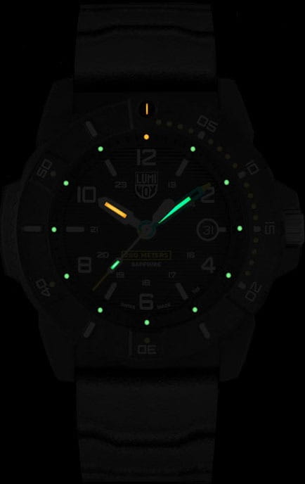 Швейцарские кварцевые часы Luminox XS.3601 идеально сочетают в себе современный стиль и надежность. Эти часы оснащены корпусом из усиленного прессованного карбонаКарбонОт «carbon», «carbone» - углерод, углепластик - полимерный композиционный материал из переплетённых под определенным углом между собой нитей углеродного волокна, применяется для изготовления лёгких, но прочных деталей. В часах часто используют для украшения циферблатов и ремешков. Так же карбон используется в изготовлении корпусов. Такие корпуса обладают антикоррозионным свойством, не поддаются электромагнитному излучению, обладают повышенной прочностью и противоударностью., что обеспечивает их легкость и прочность. Черный циферблат подчеркивает спортивный дизайн модели, а полиуретановый ремешок с классической застежкой обеспечивает комфорт при носке. Часы обладают водозащитой на глубине до 200 метров, что делает их идеальным выбором для любителей водных видов спорта. LLTLLTLLT — это автономный механизм подсветки, основанный на использовании микроскопических газонаполненных элементов. Специальные герметичные капсулы из боросиликатного стекла, интегрированные в циферблат, генерируют свечение без необходимости подключения к внешним источникам энергии. Для их работы не требуется ни дополнительный свет, ни механическое воздействие (например, нажатие кнопки). Свечение возникает благодаря химическому процессу: реакция между тритием, заключенным в капсулах, и люминофорным покрытием создает стабильное автономное освещение. Технология обеспечивает энергетическую независимость и долговечность подсветки.-подсветка гарантирует отличную видимость в темное время суток, а сапфировое стеклоСапфировое стеклоПрочный и надёжный материал из кристалла сапфира синтетического происхождения, характеризующийся особой твёрдостью и устойчивостью к царапинам и повреждениям. с антибликовым покрытиемАнтибликовое покрытиеСлой оксида металла в 0,13-0,3 микрон, благодаря которому стекло часов не бликует и не отражает свет. Антибликовое покрытие уменьшает отражение света в 10 раз, обеспечивая отличную читаемость показателей циферблата. защищает от царапин и обеспечивает четкость отображения. Модель оснащена функцией календаря с окошком даты, дополненным увеличительным стеклом для удобства использования. Часы поддерживают 12-ти и 24-х часовой формат времени, а вращающийся в одном направлении безельБезельВнешний ободок, закрепляющий стекло. В спортивных часах так называется поворотное кольцо с делениями на циферблате, выполняет роль таймера – замеряет отрезки времени на шкале. Неподвижный безель – элемент декора. Однонаправленно вращающийся безель на дайверских часах позволяет фиксировать моменты погружения и выныривания на поверхность. позволяет отслеживать время погружения или других активностей. Задняя крышка и заводная головка выполнены из стали, что добавляет дополнительную прочность конструкции. Заводная головка с защитой предотвращает случайное изменение времени. Благодаря диаметру в 45 мм и толщине 14 мм, эти часы обладают внушительным и привлекательным внешним видом, а их вес всего 75 граммов делает их крайне удобными для ежедневного использования.