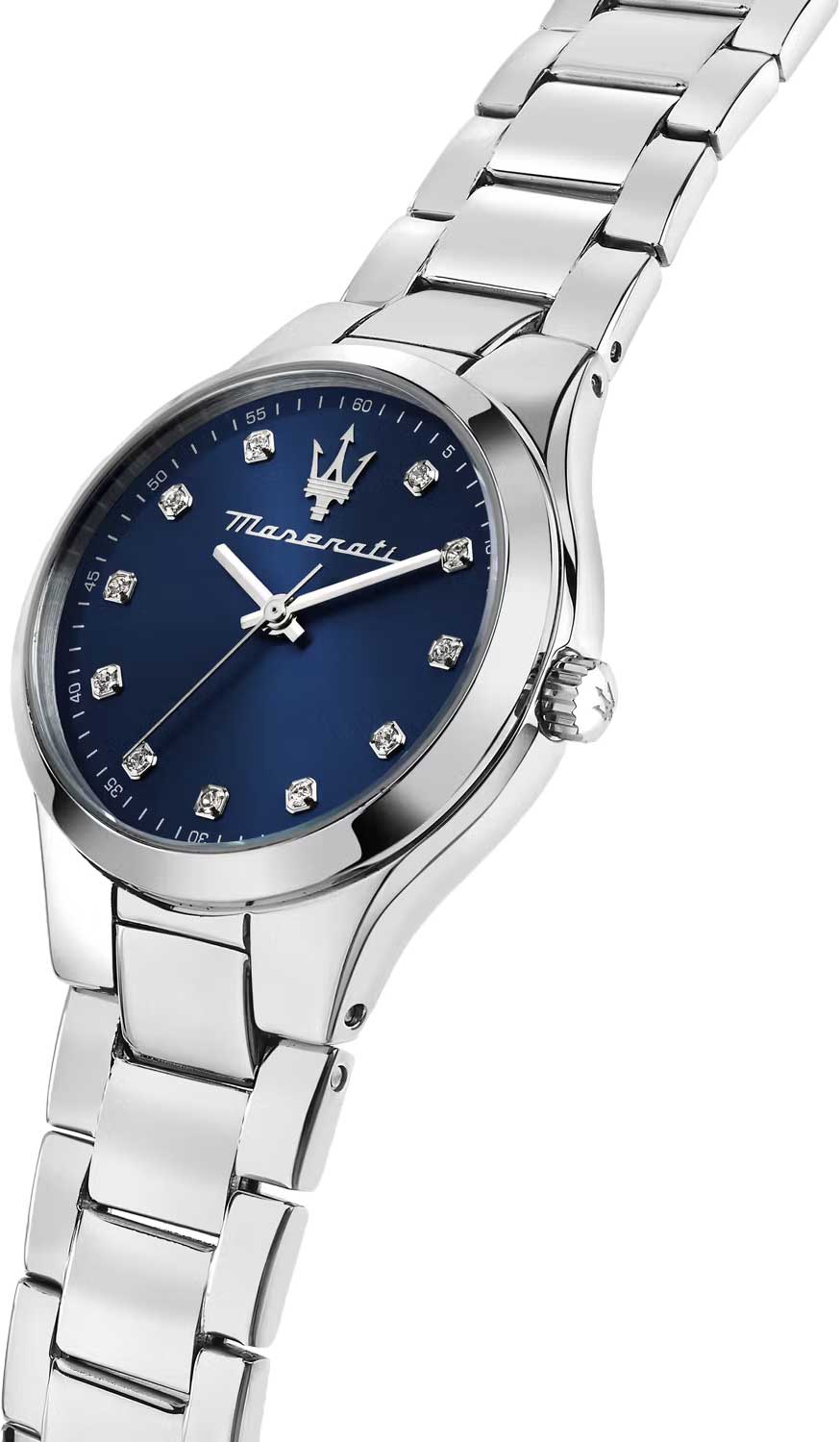 Maserati Attrazione R8853151506 — воплощение стиля и функциональности для современных женщин, ценящих качество и элегантность. Корпус диаметром 30 мм выполнен из нержавеющей стали, обеспечивая прочность и долговечность.Минеральное стеклоМинеральное стеклоМинеральное стекло представляет собой искусственно выращенный минерал кварца. Такое стекло отличается особой устойчивостью к повреждениям и царапинам. Уступает по некоторым качествам сапфировому стеклу. надежно защищает синий циферблат с изящными рисками, придавая часам утонченный вид. Благодаря водостойкости до 50 метров (50 АТМ), эти часы станут вашим надежным спутником в любых условиях, будь то деловая встреча или активный отдых. Завершающий штрих — стальной браслет с раскладной застёжкойРаскладная застёжкаТакой тип застёжки используется только на браслетах из металла. Она никогда не раскрывается полностью, происходит разделение на 2 и более частей. Раскладывающая застёжка снизит вероятность потери часов к минимуму., который подчеркивает общий стиль, обеспечивая комфорт и надежность в носке. Циферблат выполнен по технологии Sunray (солнечные лучи) и украшен фирменным логотипом «Maserati». Метки в виде точек, инкрустированные кристаллами.