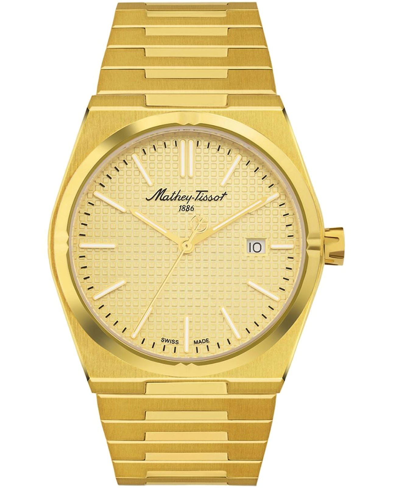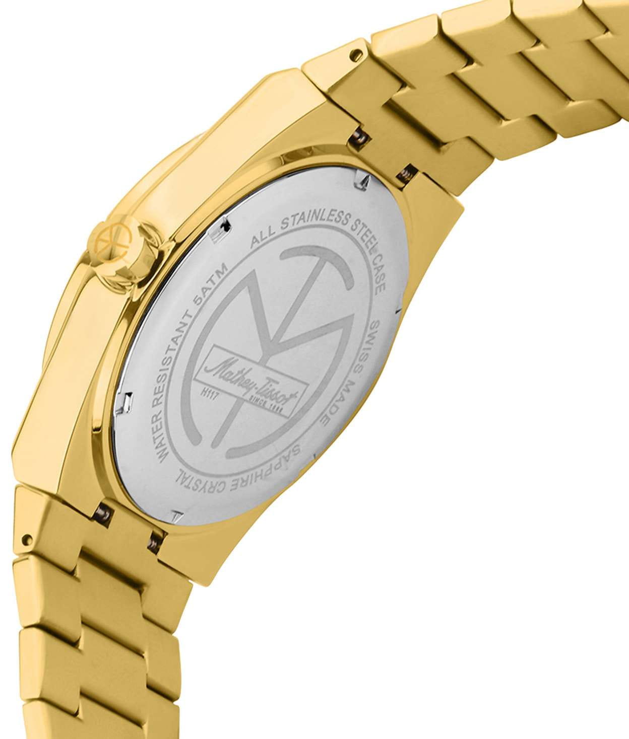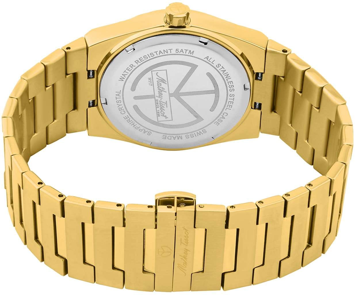 Мужские кварцевые часы Mathey-Tissot Zoltan H117PDI — это стильное сочетание элегантности и современного дизайна. Изящный корпус выполнен из нержавеющей стали с PVD-покрытиемPVDУльтратонкое покрытие наносится в технике вакуумного напыления, сочетает в себе нитрид титана особой прочности со слоем золота или оксида хрома. Несёт в себе декоративную или защитную функцию. золотистого цвета, диаметром 42 мм, что придаст образу элегантности и надежности. Изысканный циферблат с метками в виде штрихов придает модели особый блеск. Циферблат защищен сапфировым стекломСапфировое стеклоПрочный и надёжный материал из кристалла сапфира синтетического происхождения, характеризующийся особой твёрдостью и устойчивостью к царапинам и повреждениям., обеспечивающий устойчивость к царапинам. Стрелки и метки с люминесцентным покрытиемЛюминесцентное покрытиеПозволяет считывать показания времени в темноте. Производители наносят на стрелки, часовые индексы, безель или поверхность циферблата светонакопительный состав, дающий холодное свечение.. Окошко даты находится в положении 3 часа. Часы оснащены надежным кварцевым механизмом. Стальной браслет с PVD-покрытиемPVDУльтратонкое покрытие наносится в технике вакуумного напыления, сочетает в себе нитрид титана особой прочности со слоем золота или оксида хрома. Несёт в себе декоративную или защитную функцию. на застёжке-бабочке с кнопкамиЗастёжка "бабочка"Такой вид застёжки дополняется предохранителями, помогающими избежать случайного раскрытия браслета. Обладают изящным исполнением. , гарантирует комфортное и безопасное ношение. Класс водозащиты: 50 метров позволит защитить корпус от случайных брызг или капель дождя. Mathey-Tissot  — отличный выбор для тех, кто ценит утонченность и качество.