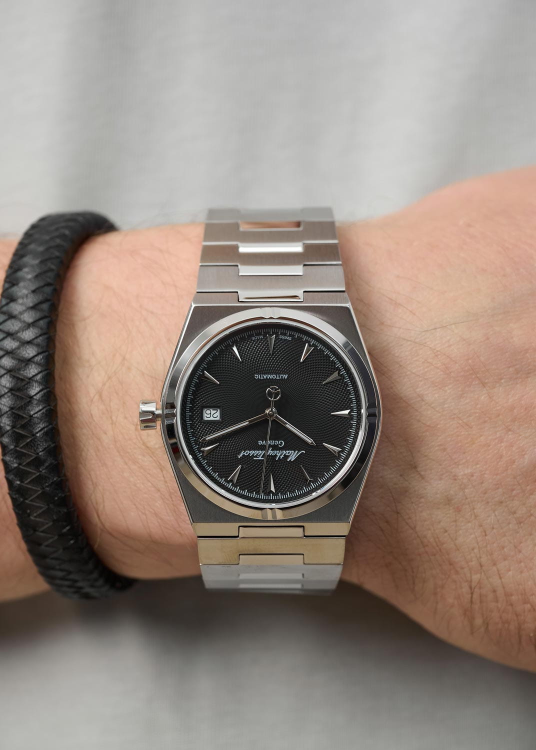 Мужские механические часы с автоподзаводом Mathey-Tissot Zeus H118ATAN — это стильное сочетание элегантности и современного дизайна. Изящный корпус выполнен из нержавеющей стали, диаметром 41 мм и толщиной 12 мм, что придаст образу элегантности и надежности. Изысканный циферблат с метками в виде штрихов придает модели особый блеск. Циферблат защищен сапфировым стекломСапфировое стеклоПрочный и надёжный материал из кристалла сапфира синтетического происхождения, характеризующийся особой твёрдостью и устойчивостью к царапинам и повреждениям., обеспечивающий устойчивость к царапинам. Стрелки с люминесцентным покрытиемЛюминесцентное покрытиеПозволяет считывать показания времени в темноте. Производители наносят на стрелки, часовые индексы, безель или поверхность циферблата светонакопительный состав, дающий холодное свечение. SuperLumiNova, которое светится в темноте после непродолжительной зарядки на свету. Окошко даты находится в положении 3 часа. Стальной браслет на застёжке-бабочке с кнопкамиЗастёжка "бабочка"Такой вид застёжки дополняется предохранителями, помогающими избежать случайного раскрытия браслета. Обладают изящным исполнением. , гарантирует комфортное и безопасное ношение. Класс водозащиты: 50 метров позволит защитить корпус от случайных брызг или капель дождя. Mathey-Tissot — отличный выбор для тех, кто ценит утонченность и качество.