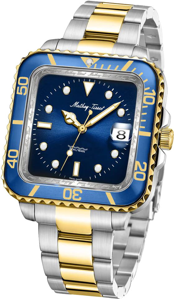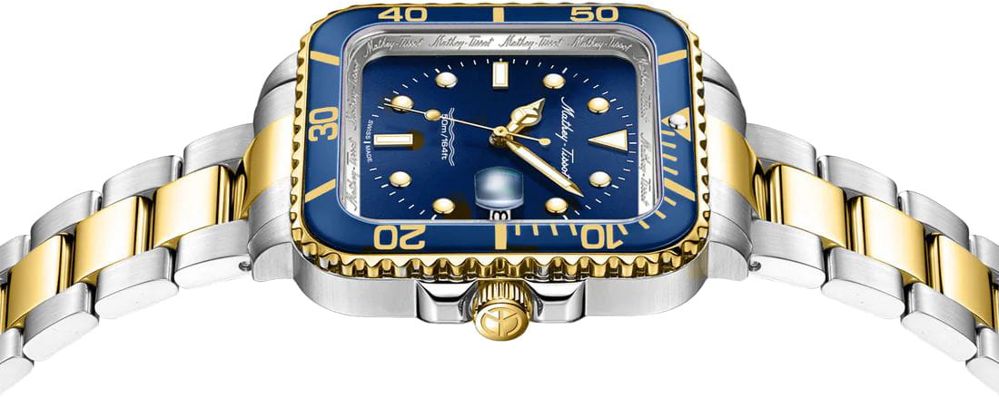 Мужские кварцевые часы Mathey-Tissot Mathy H902QBBU — это стильное сочетание элегантности и современного дизайна. Изящный корпус выполнен из нержавеющей стали, диаметром 42 мм, что придаст образу элегантности и надежности. Изысканный циферблат с метками в виде точек придает модели особый блеск. Циферблат защищен сапфировым стекломСапфировое стеклоПрочный и надёжный материал из кристалла сапфира синтетического происхождения, характеризующийся особой твёрдостью и устойчивостью к царапинам и повреждениям., обеспечивает устойчивость к царапинам. Стрелки и метки с люминесцентным покрытиемЛюминесцентное покрытиеПозволяет считывать показания времени в темноте. Производители наносят на стрелки, часовые индексы, безель или поверхность циферблата светонакопительный состав, дающий холодное свечение. SuperLumiNova, которое светится в темноте после непродолжительной зарядки на свету. БезельБезельВнешний ободок, закрепляющий стекло. В спортивных часах так называется поворотное кольцо с делениями на циферблате, выполняет роль таймера – замеряет отрезки времени на шкале. Неподвижный безель – элемент декора. Однонаправленно вращающийся безель на дайверских часах позволяет фиксировать моменты погружения и выныривания на поверхность. с PVD-покрытиемPVDУльтратонкое покрытие наносится в технике вакуумного напыления, сочетает в себе нитрид титана особой прочности со слоем золота или оксида хрома. Несёт в себе декоративную или защитную функцию. синего цвета. Окошко даты находится в положении 3 часа. Стальной браслет с частичным PVD-покрытиемPVDУльтратонкое покрытие наносится в технике вакуумного напыления, сочетает в себе нитрид титана особой прочности со слоем золота или оксида хрома. Несёт в себе декоративную или защитную функцию. на раскладной застёжке с фиксаторомРаскладная застёжкаТакой тип застёжки используется только на браслетах из металла. Она никогда не раскрывается полностью, происходит разделение на 2 и более частей. Раскладывающая застёжка снизит вероятность потери часов к минимуму., гарантирует комфортное и безопасное ношение. Рифленая заводная головка. Класс водозащиты: 50 метров позволит защитить корпус от случайных брызг или капель дождя. Mathey-Tissot — отличный выбор для тех, кто ценит утонченность и качество.