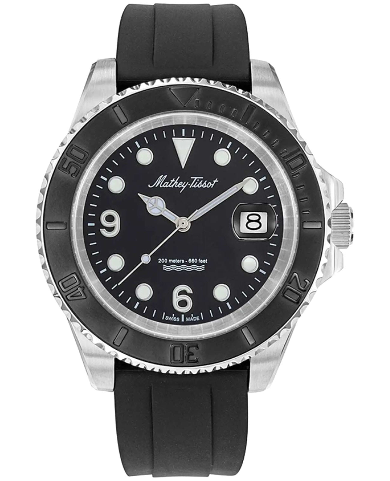 Мужские кварцевые часы Mathey-Tissot Mathy H909AN — это стильное сочетание элегантности и современного дизайна. Изящный корпус выполнен из нержавеющей стали, диаметром 42 мм, что придаст образу элегантности и надежности. Циферблат с метками в виде точек и арабских цифр придает модели особый блеск. Циферблат защищен минеральным стекломМинеральное стеклоМинеральное стекло представляет собой искусственно выращенный минерал кварца. Такое стекло отличается особой устойчивостью к повреждениям и царапинам. Уступает по некоторым качествам сапфировому стеклу. с сапфировым покрытием, обеспечивает устойчивость к царапинам. Стрелки и метки с люминесцентным покрытиемЛюминесцентное покрытиеПозволяет считывать показания времени в темноте. Производители наносят на стрелки, часовые индексы, безель или поверхность циферблата светонакопительный состав, дающий холодное свечение.. Окошко даты находится в положении 3 часа.  Вращающийся безельБезельВнешний ободок, закрепляющий стекло. В спортивных часах так называется поворотное кольцо с делениями на циферблате, выполняет роль таймера – замеряет отрезки времени на шкале. Неподвижный безель – элемент декора. Однонаправленно вращающийся безель на дайверских часах позволяет фиксировать моменты погружения и выныривания на поверхность. в одном направлении. Часы оснащены надежным кварцевым механизмом. Силиконовый ремешок с раскладной застёжкойРаскладная застёжкаТакой тип застёжки используется только на браслетах из металла. Она никогда не раскрывается полностью, происходит разделение на 2 и более частей. Раскладывающая застёжка снизит вероятность потери часов к минимуму. гарантирует комфортное и безопасное ношение. Класс водозащиты: 200 метров позволит плавать, нырять и заниматься другими водными видами спорта. Mathey-Tissot  — отличный выбор для тех, кто ценит утонченность и качество.