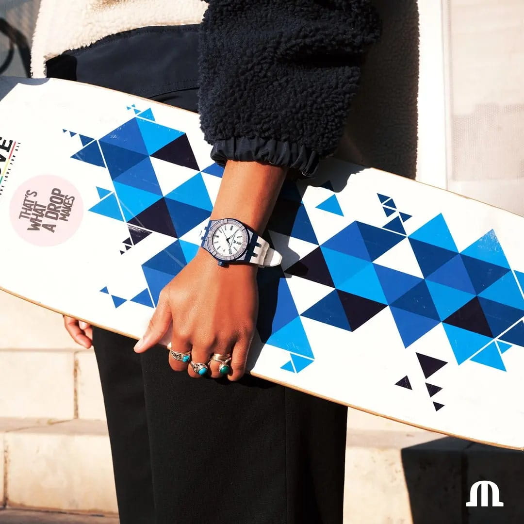 Часы AIKON #tide обладают всеми преимуществами AIKON, но кроме того, они выполнены из особого материала под названием #tideocean – переработанного океанского пластика, усиленного стекловолокном. В результате сложного технологического процесса переработки получен композитный материал, вдвое превосходящий по прочности обычный пластик. Износостойкость композита #tideocean в пять раз выше полиэтилентерефталата (ПЭТ). И еще немаловажный экологический фактор – в процессе превращения океанского пластика в материал #tideocean углеродные выбросы в атмосферу значительно снижаются, чем при обычном процессе выпуска первичного пластика. В новой модели безельБезельВнешний ободок, закрепляющий стекло. В спортивных часах так называется поворотное кольцо с делениями на циферблате, выполняет роль таймера – замеряет отрезки времени на шкале. Неподвижный безель – элемент декора. Однонаправленно вращающийся безель на дайверских часах позволяет фиксировать моменты погружения и выныривания на поверхность., корпус, задняя крышка, заводная головка, наконечник и застежка выполнены из композитного материала #tideocean. 17 пластиковых бутылок требуется для производства одних отличных часов и их специальной упаковки, также на 100% состоящей из материала #tide, появившегося в результате отходов пластика в океане. В результате такой переработки выигрывают все. Мужские швейцарские кварцевые часы Maurice Lacroix Aikon Quartz AI2008-BBB11-300-0. Сапфировое стеклоСапфировое стеклоПрочный и надёжный материал из кристалла сапфира синтетического происхождения, характеризующийся особой твёрдостью и устойчивостью к царапинам и повреждениям. устойчивое к появлению царапин, обладающее высокой прозрачностью. Белый циферблат. Стрелки и метки с люминесцентным покрытиемЛюминесцентное покрытиеПозволяет считывать показания времени в темноте. Производители наносят на стрелки, часовые индексы, безель или поверхность циферблата светонакопительный состав, дающий холодное свечение.. Класс водозащиты: 100 метров, позволит плавать, нырять и заниматься другими водными видами спорта. Окошко даты находится в положении 3 часов. Циферблат с тематическим гильошированием "Vagues du Jura". Корпус выполнен из переработанного пластика, ранее загрязнявшего Мировой океан. Каучуковый ремешок с классической застежкой.