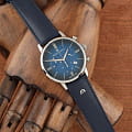 Модель оснащена кварцевым механизмом с функцией хронографаХронографФункция позволяет измерять отрезки времени с особой точностью: часы, минуты, секунды. Верным признаком хронографа является наличие на циферблате 3 дополнительных окошек-счётчиков., включающим центральную секундную стрелку, 30-минутный счётчик на позиции «9 часов» и 1/10-секундный счётчик на позиции «6 часов». Индикация даты расположена в положении «4:30».