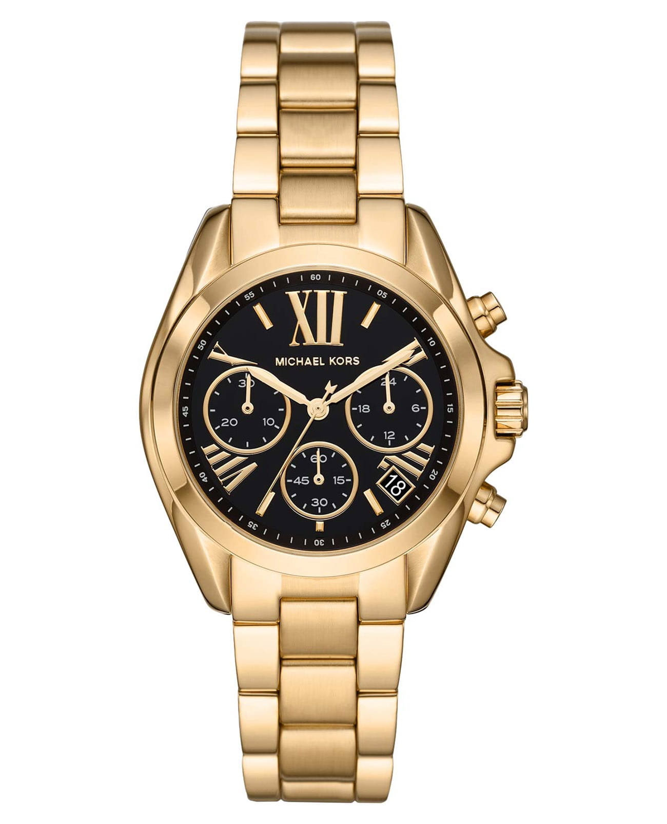 Женские американские часы-хронографХронографФункция позволяет измерять отрезки времени с особой точностью: часы, минуты, секунды. Верным признаком хронографа является наличие на циферблате 3 дополнительных окошек-счётчиков. с секундомеромСекундомерСекундоме́р — прибор, способный измерять интервалы времени с точностью до долей секунды. и с минеральным стекломМинеральное стеклоМинеральное стекло представляет собой искусственно выращенный минерал кварца. Такое стекло отличается особой устойчивостью к повреждениям и царапинам. Уступает по некоторым качествам сапфировому стеклу. Michael Kors Bradshaw MK6959, кварцевый механизм с высокой точностью. Корпус часов изготовлен из стали с PVD-покрытиемPVDУльтратонкое покрытие наносится в технике вакуумного напыления, сочетает в себе нитрид титана особой прочности со слоем золота или оксида хрома. Несёт в себе декоративную или защитную функцию.. На циферблате расположены три дополнительных индикатора. Метки в виде штрихов и римских цифр. Окошко даты находится между 4 и 5 часами. Заводная головка с защитой. Класс водозащиты: 100 метров, позволит плавать, нырять и заниматься другими водными видами спорта. Стальной браслет с PVD-покрытиемPVDУльтратонкое покрытие наносится в технике вакуумного напыления, сочетает в себе нитрид титана особой прочности со слоем золота или оксида хрома. Несёт в себе декоративную или защитную функцию. на раскладной застёжкеРаскладная застёжкаТакой тип застёжки используется только на браслетах из металла. Она никогда не раскрывается полностью, происходит разделение на 2 и более частей. Раскладывающая застёжка снизит вероятность потери часов к минимуму..