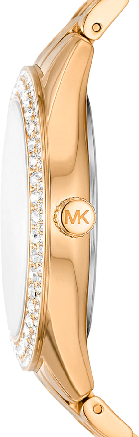 Женские американские часы с минеральным стекломМинеральное стеклоМинеральное стекло представляет собой искусственно выращенный минерал кварца. Такое стекло отличается особой устойчивостью к повреждениям и царапинам. Уступает по некоторым качествам сапфировому стеклу. Michael Kors Harlowe MK4709, кварцевый механизм с высокой точностью. Корпус и браслет часов изготовлены из нержавеющей стали с PVD-покрытиемPVDУльтратонкое покрытие наносится в технике вакуумного напыления, сочетает в себе нитрид титана особой прочности со слоем золота или оксида хрома. Несёт в себе декоративную или защитную функцию.. Циферблат, и безельБезельВнешний ободок, закрепляющий стекло. В спортивных часах так называется поворотное кольцо с делениями на циферблате, выполняет роль таймера – замеряет отрезки времени на шкале. Неподвижный безель – элемент декора. Однонаправленно вращающийся безель на дайверских часах позволяет фиксировать моменты погружения и выныривания на поверхность. украшены кристаллами. Метки в виде штрихов и римских цифр. Заводная головка с защитой. Класс водозащиты: 50 метров, позволит защитить корпус от случайных брызг или капель дождя. Стальной браслет на раскладной застёжкеРаскладная застёжкаТакой тип застёжки используется только на браслетах из металла. Она никогда не раскрывается полностью, происходит разделение на 2 и более частей. Раскладывающая застёжка снизит вероятность потери часов к минимуму..