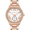 Эти часы — идеальный аксессуар, который придаст женскому образу завершенность и особый шарм. Женские американские часы Michael Kors Sage MK4806 имеют кварцевый механизм с высокой точностью. Корпус и браслет часов изготовлены из нержавеющей стали с розово-золотистым PVD-покрытиемPVDУльтратонкое покрытие наносится в технике вакуумного напыления, сочетает в себе нитрид титана особой прочности со слоем золота или оксида хрома. Несёт в себе декоративную или защитную функцию.. Перламутровый циферблат и безельБезельВнешний ободок, закрепляющий стекло. В спортивных часах так называется поворотное кольцо с делениями на циферблате, выполняет роль таймера – замеряет отрезки времени на шкале. Неподвижный безель – элемент декора. Однонаправленно вращающийся безель на дайверских часах позволяет фиксировать моменты погружения и выныривания на поверхность. украшены кристаллами. Циферблат с метками в виде римских цифр и штрихов защищен минеральным стекломМинеральное стеклоМинеральное стекло представляет собой искусственно выращенный минерал кварца. Такое стекло отличается особой устойчивостью к повреждениям и царапинам. Уступает по некоторым качествам сапфировому стеклу., что обеспечивает надежную защиту от царапин и повреждений. Секундная стрелка вынесена на отдельный циферблат, обрамленный кристаллами, что придает часам уникальный и стильный вид. Люминесцентное покрытиеЛюминесцентное покрытиеПозволяет считывать показания времени в темноте. Производители наносят на стрелки, часовые индексы, безель или поверхность циферблата светонакопительный состав, дающий холодное свечение. на стрелках обеспечивает отличную видимость в темноте. Класс водозащиты: 50 метров, позволит защитить корпус от случайных брызг или капель дождя. Стальной браслет с розово-золотистым PVD-покрытиемPVDУльтратонкое покрытие наносится в технике вакуумного напыления, сочетает в себе нитрид титана особой прочности со слоем золота или оксида хрома. Несёт в себе декоративную или защитную функцию. на раскладной застёжкеРаскладная застёжкаТакой тип застёжки используется только на браслетах из металла. Она никогда не раскрывается полностью, происходит разделение на 2 и более частей. Раскладывающая застёжка снизит вероятность потери часов к минимуму. обеспечивает надежную фиксацию на запястье и легкость в надевании и снятии. Эти часы станут отличным дополнением к любому наряду, подчеркивая индивидуальность и стиль их обладательницы.