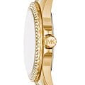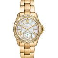 Женские американские часы с секундомеромСекундомерСекундоме́р — прибор, способный измерять интервалы времени с точностью до долей секунды. и с минеральным стекломМинеральное стеклоМинеральное стекло представляет собой искусственно выращенный минерал кварца. Такое стекло отличается особой устойчивостью к повреждениям и царапинам. Уступает по некоторым качествам сапфировому стеклу. Michael Kors Everest MK7363, кварцевый механизм с высокой точностью. Корпус часов изготовлен из нержавеющей стали с PVD-покрытиемPVDУльтратонкое покрытие наносится в технике вакуумного напыления, сочетает в себе нитрид титана особой прочности со слоем золота или оксида хрома. Несёт в себе декоративную или защитную функцию.. БезельБезельВнешний ободок, закрепляющий стекло. В спортивных часах так называется поворотное кольцо с делениями на циферблате, выполняет роль таймера – замеряет отрезки времени на шкале. Неподвижный безель – элемент декора. Однонаправленно вращающийся безель на дайверских часах позволяет фиксировать моменты погружения и выныривания на поверхность. и циферблат украшены кристаллами. Метки в виде штрихов и римских цифр. Секундная стрелка вынесена на малый циферблат. Метки с люминесцентным покрытиемЛюминесцентное покрытиеПозволяет считывать показания времени в темноте. Производители наносят на стрелки, часовые индексы, безель или поверхность циферблата светонакопительный состав, дающий холодное свечение.. Заводная головка с защитой. Класс водозащиты: 50 метров, позволит защитить корпус от случайных брызг или капель дождя. Стальной браслет с PVD-покрытиемPVDУльтратонкое покрытие наносится в технике вакуумного напыления, сочетает в себе нитрид титана особой прочности со слоем золота или оксида хрома. Несёт в себе декоративную или защитную функцию. на раскладной застёжкеРаскладная застёжкаТакой тип застёжки используется только на браслетах из металла. Она никогда не раскрывается полностью, происходит разделение на 2 и более частей. Раскладывающая застёжка снизит вероятность потери часов к минимуму..