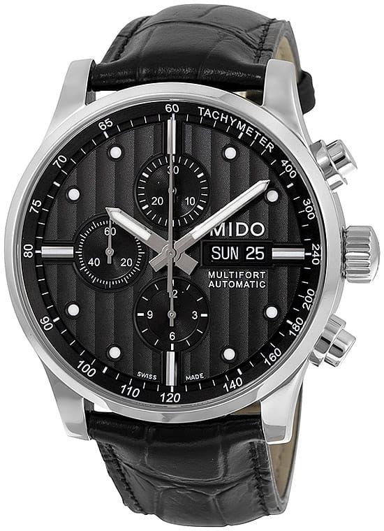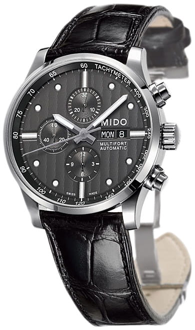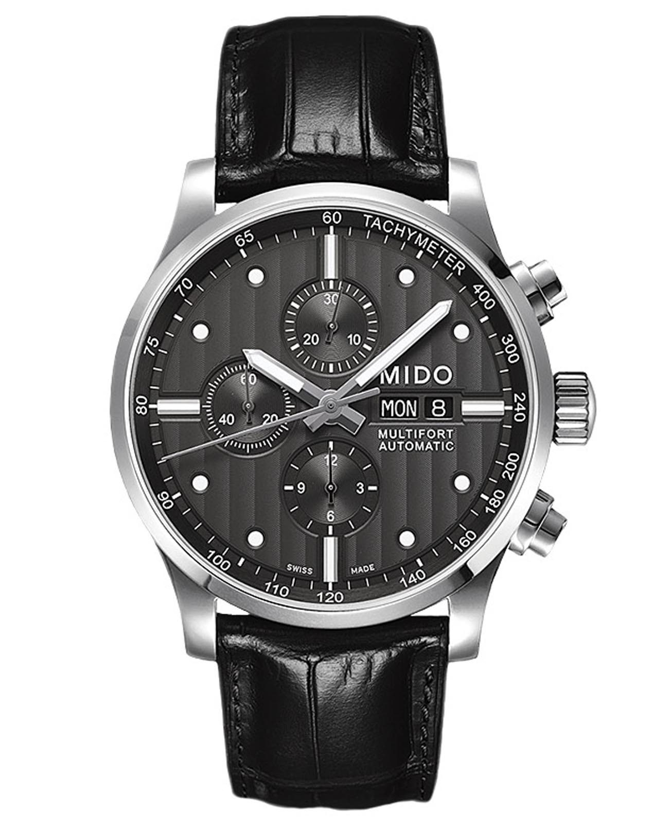 Мужские швейцарские механические часы-хронографХронографФункция позволяет измерять отрезки времени с особой точностью: часы, минуты, секунды. Верным признаком хронографа является наличие на циферблате 3 дополнительных окошек-счётчиков. Mido Multifort Chronograph M005.614.16.061.00, механический механизм (автоматический калибр) с высокой точностью. Сапфировое стеклоСапфировое стеклоПрочный и надёжный материал из кристалла сапфира синтетического происхождения, характеризующийся особой твёрдостью и устойчивостью к царапинам и повреждениям. устойчивое к появлению царапин, обладающее высокой прозрачностью. Класс водозащиты: 100 метров, позволит плавать, нырять и заниматься другими водными видами спорта. Корпус часов изготовлен из стали.