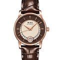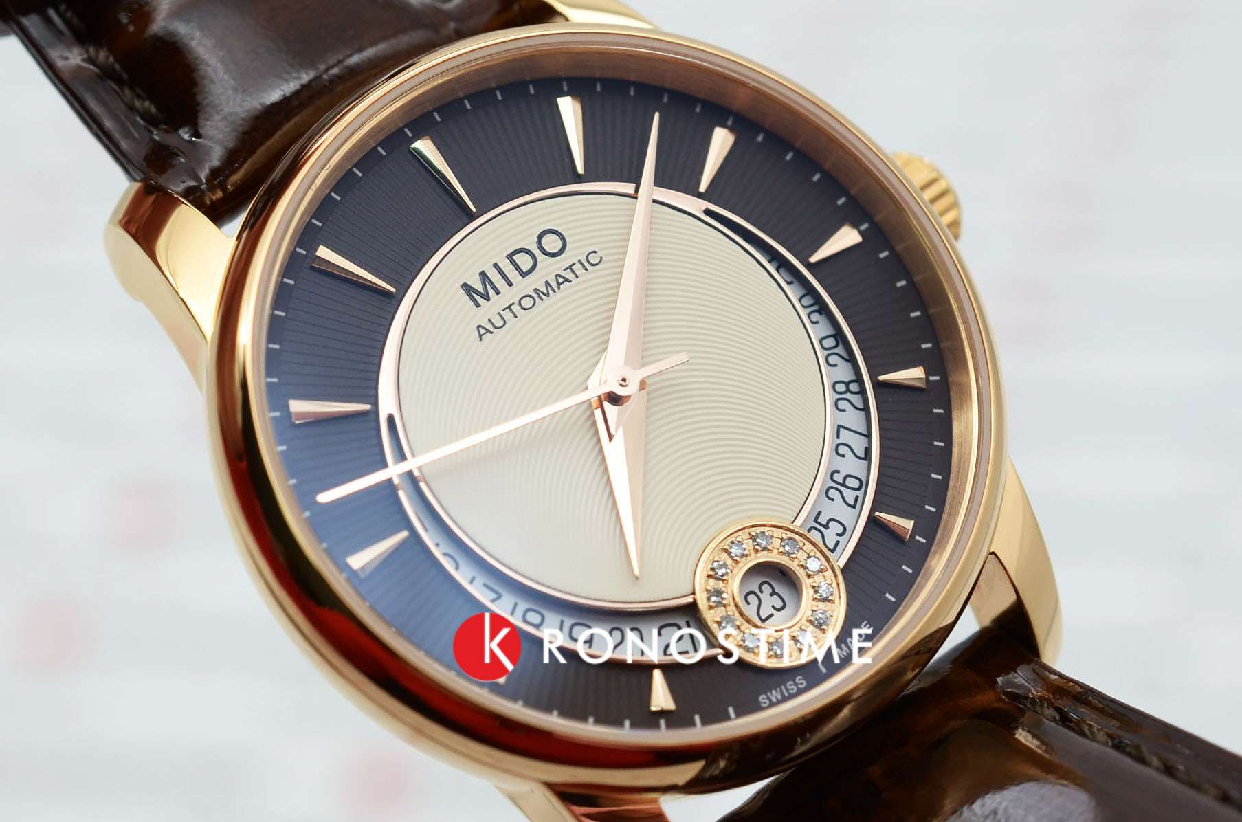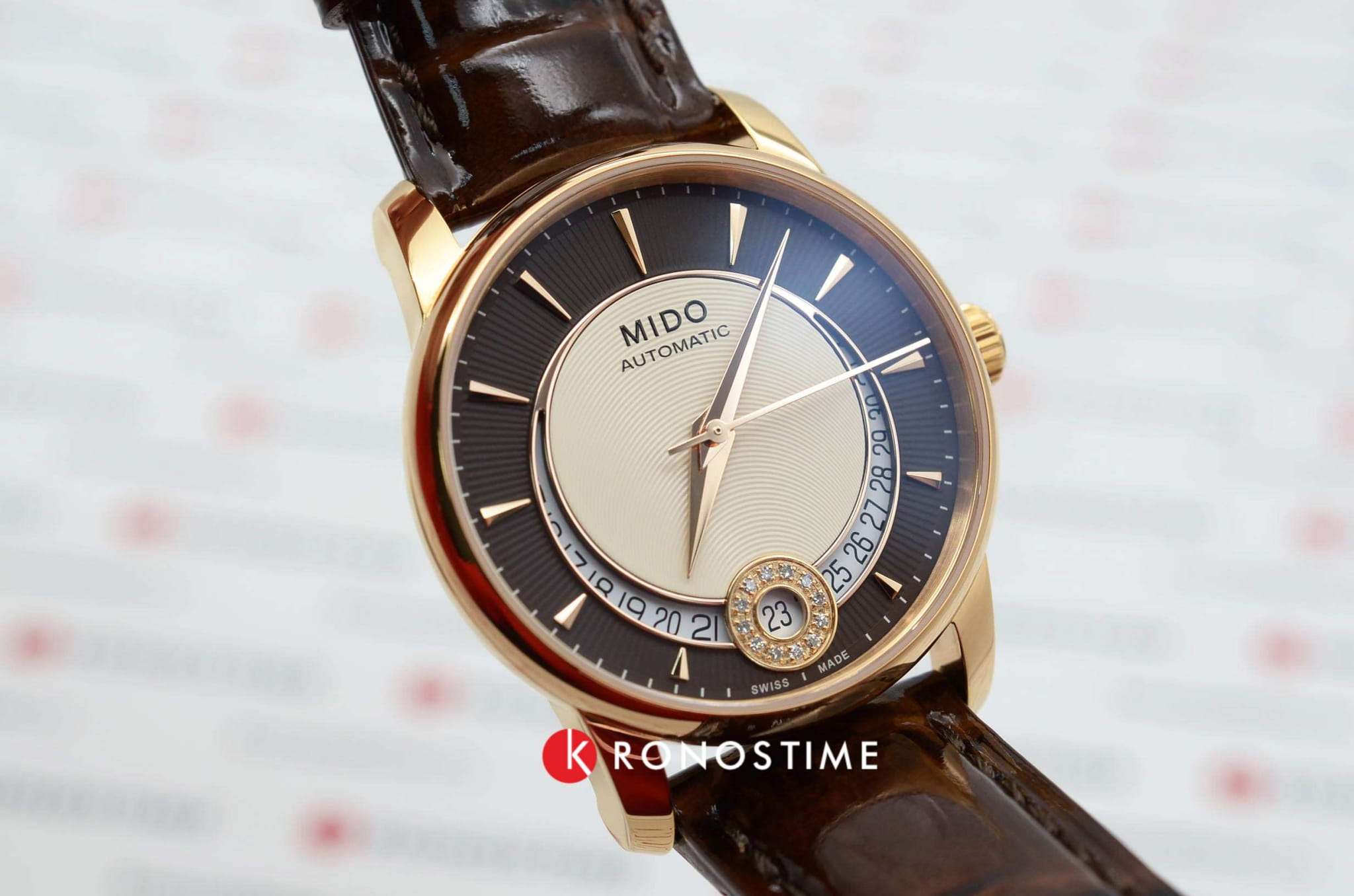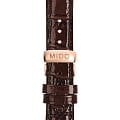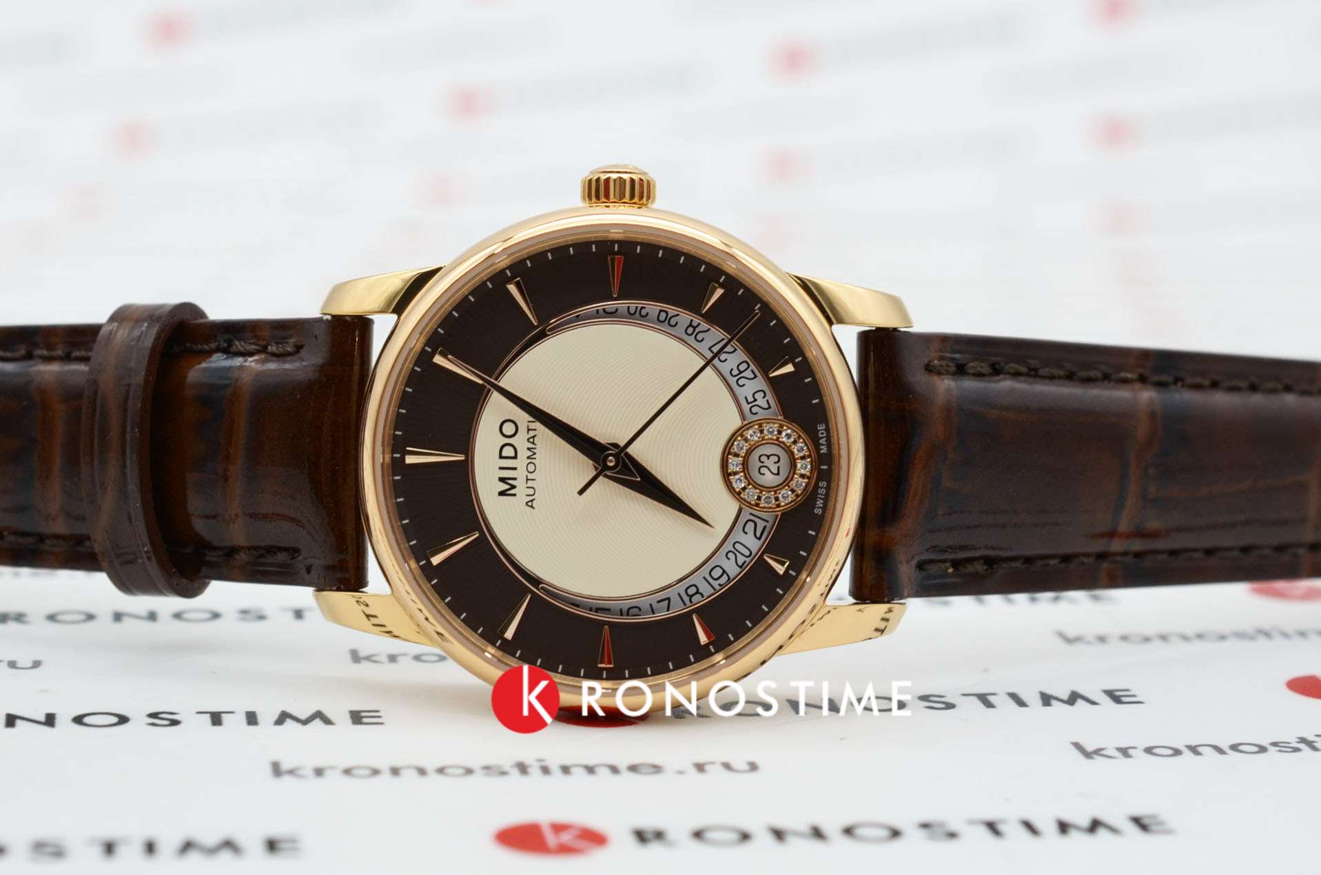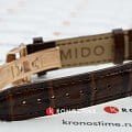 Mido Baroncelli Diamonds M007.207.36.291.00 – элегантные женские часы, сочетающие классический стиль и современные технологии. Корпус диаметром 33 мм и толщиной 9,4 мм выполнен из нержавеющей стали с PVD-покрытиемPVDУльтратонкое покрытие наносится в технике вакуумного напыления, сочетает в себе нитрид титана особой прочности со слоем золота или оксида хрома. Несёт в себе декоративную или защитную функцию. розового золота, обеспечивая прочность и стильный внешний вид. Бежево-коричневый циферблат украшен бриллиантами, окружающими окошко даты на позиции «6 часов», добавляя изысканности и блеска, а его поверхность защищена сапфировым стекломСапфировое стеклоПрочный и надёжный материал из кристалла сапфира синтетического происхождения, характеризующийся особой твёрдостью и устойчивостью к царапинам и повреждениям. с антибликовым покрытиемАнтибликовое покрытиеСлой оксида металла в 0,13-0,3 микрон, благодаря которому стекло часов не бликует и не отражает свет. Антибликовое покрытие уменьшает отражение света в 10 раз, обеспечивая отличную читаемость показателей циферблата., устойчивым к царапинам.