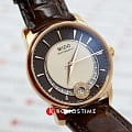 Ремешок из коричневой кожи оснащён раскладной застёжкойРаскладная застёжкаТакой тип застёжки используется только на браслетах из металла. Она никогда не раскрывается полностью, происходит разделение на 2 и более частей. Раскладывающая застёжка снизит вероятность потери часов к минимуму., обеспечивающей комфортное ношение и надёжную фиксацию на запястье. Водонепроницаемость 50 метров (5 ATM) делает эту модель идеальным выбором для повседневного использования, защищая от случайных брызг и дождя.