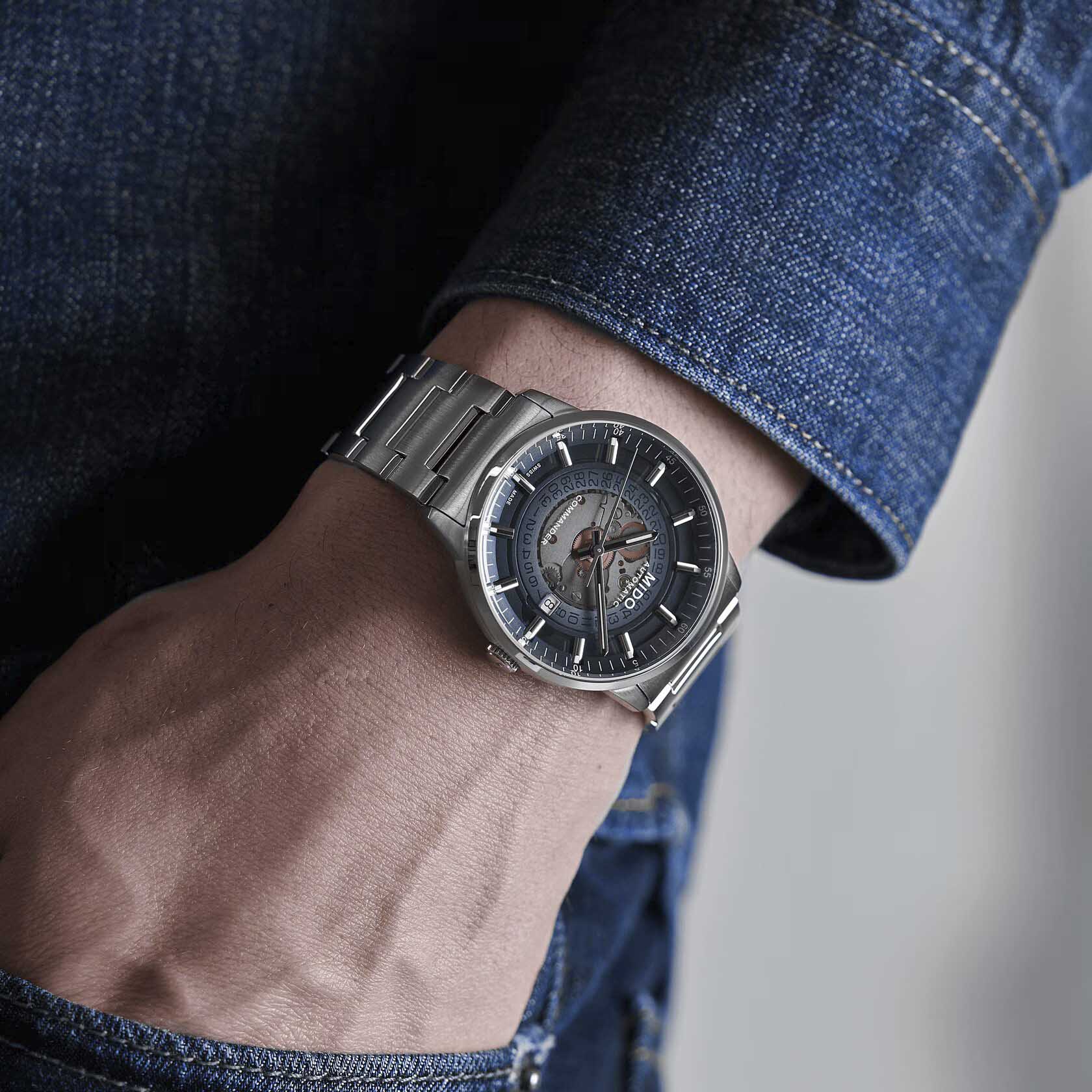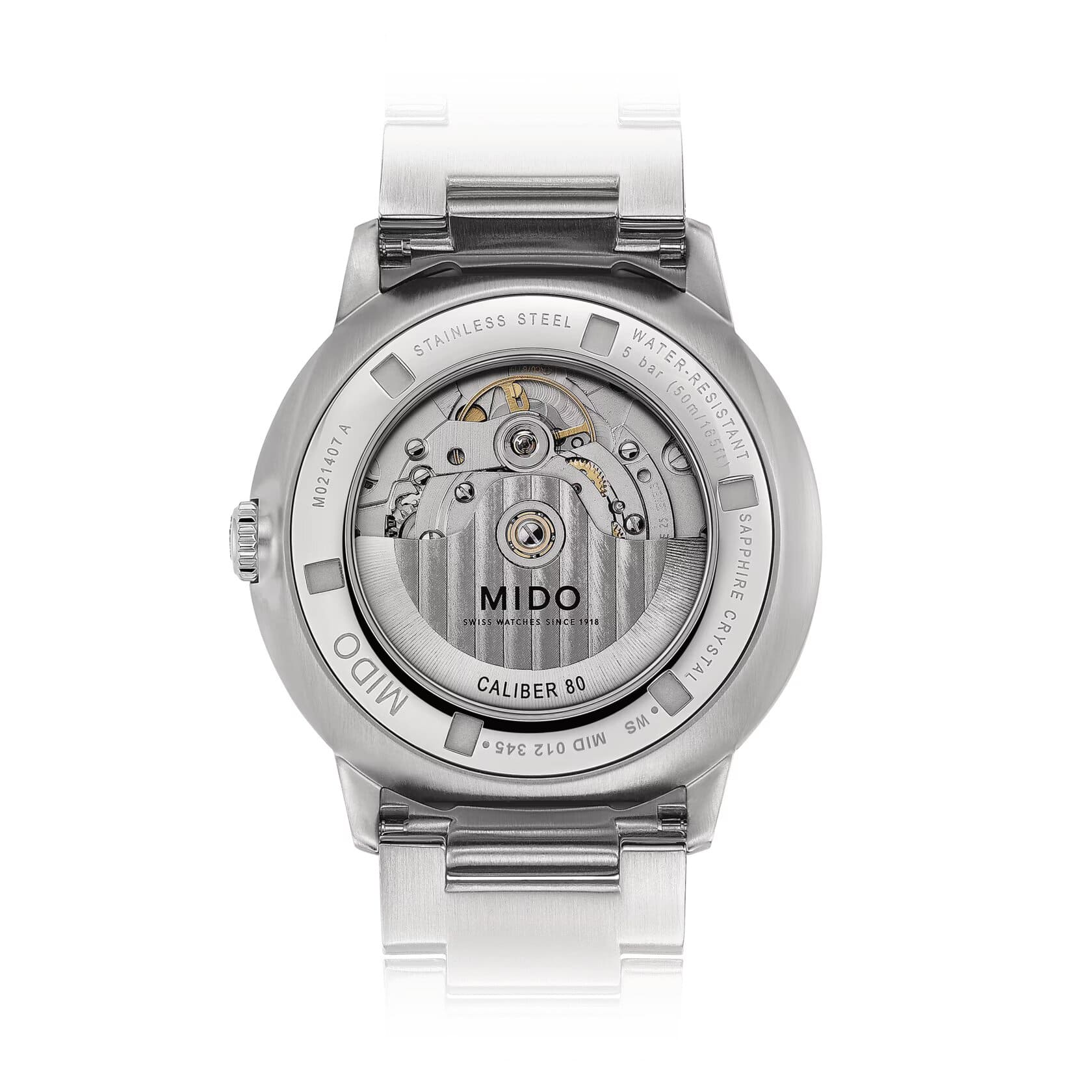Модель оснащена автоматическим механизмом MIDO Caliber 80 на базе ETA C07.611, обеспечивающим запас хода до 80 часов. Функционал включает индикацию часов, минут, секунд и даты, расположенной в положении «3 часа».