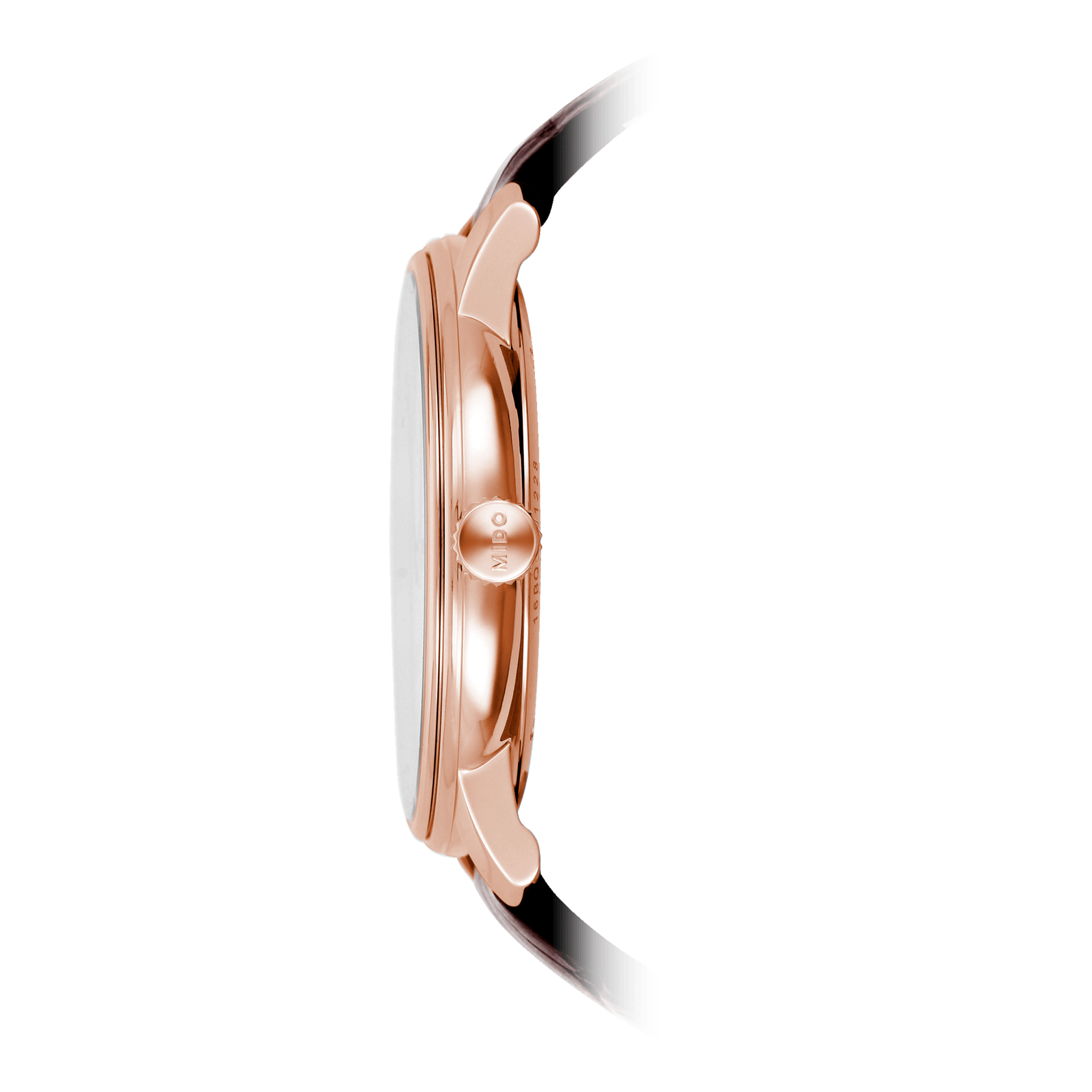 Часы Mido Baroncelli Heritage Gent M027.407.36.080.00 — это элегантный мужской аксессуар, объединяющий классический стиль и современные технологии. Корпус диаметром 39 мм выполнен из нержавеющей стали с розовым PVD-покрытиемPVDУльтратонкое покрытие наносится в технике вакуумного напыления, сочетает в себе нитрид титана особой прочности со слоем золота или оксида хрома. Несёт в себе декоративную или защитную функцию., что придаёт часам изысканный вид. Серый циферблат с розово-золотистыми стрелками и индексами защищён сапфировым стекломСапфировое стеклоПрочный и надёжный материал из кристалла сапфира синтетического происхождения, характеризующийся особой твёрдостью и устойчивостью к царапинам и повреждениям., устойчивым к царапинам.