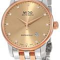 Mido Baroncelli M8600.4.26.1 — элегантная модель, сочетающая классику и современную швейцарскую инженерию. Корпус диаметром 38 мм изготовлен из нержавеющей стали и дополнен браслетом с PVD-покрытиемPVDУльтратонкое покрытие наносится в технике вакуумного напыления, сочетает в себе нитрид титана особой прочности со слоем золота или оксида хрома. Несёт в себе декоративную или защитную функцию. в пять рядов, снабжённым раскладной застёжкойРаскладная застёжкаТакой тип застёжки используется только на браслетах из металла. Она никогда не раскрывается полностью, происходит разделение на 2 и более частей. Раскладывающая застёжка снизит вероятность потери часов к минимуму. для удобства и надежности фиксации. БезельБезельВнешний ободок, закрепляющий стекло. В спортивных часах так называется поворотное кольцо с делениями на циферблате, выполняет роль таймера – замеряет отрезки времени на шкале. Неподвижный безель – элемент декора. Однонаправленно вращающийся безель на дайверских часах позволяет фиксировать моменты погружения и выныривания на поверхность. с PVD-покрытиемPVDУльтратонкое покрытие наносится в технике вакуумного напыления, сочетает в себе нитрид титана особой прочности со слоем золота или оксида хрома. Несёт в себе декоративную или защитную функцию.. Циферблат декорирован двенадцатью бриллиантами в качестве часовых меток, что придаёт часам утончённость и ювелирный блеск.