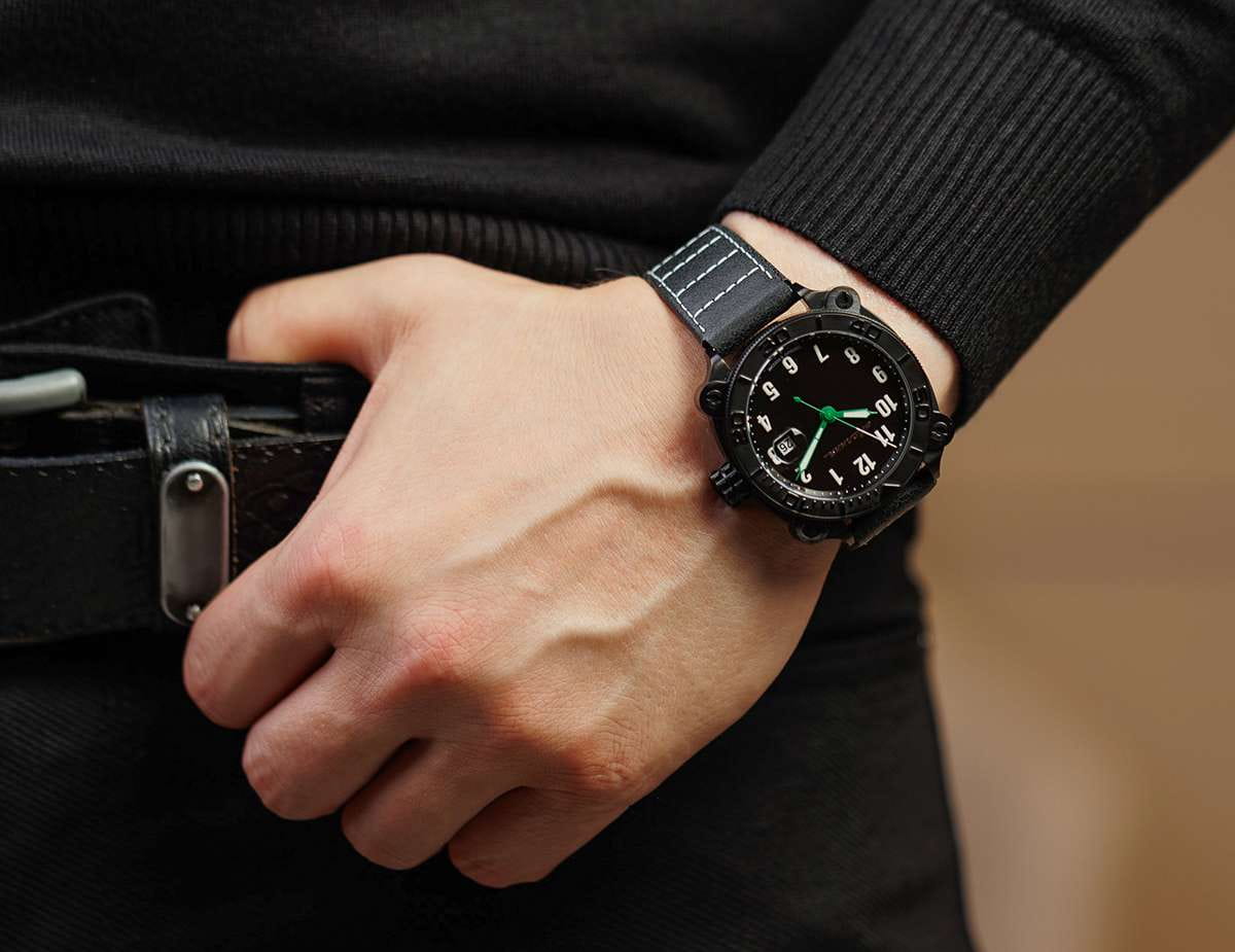 Мужские механические часы с автоподзаводом от бренда «МОЛНИЯ» — это стильный аксессуар, вдохновлённый дизайном приборной панели легендарного танка Т-72. Корпус диаметром 42 мм и толщиной 12 мм выполнен из нержавеющей стали 316L с IP-покрытиемIP-покрытиеМетод ионного напыления. Демонстрирует повышенную устойчивость к истиранию, окислению и химическим веществам. Под воздействием высокого давления и температуры около 1500°C молекулы металла надёжно соединяются с частицами корпуса часов.. БезельБезельВнешний ободок, закрепляющий стекло. В спортивных часах так называется поворотное кольцо с делениями на циферблате, выполняет роль таймера – замеряет отрезки времени на шкале. Неподвижный безель – элемент декора. Однонаправленно вращающийся безель на дайверских часах позволяет фиксировать моменты погружения и выныривания на поверхность. однонаправленный, вращающийся. Циферблат чёрного цвета оформлен арабскими цифрами и логотипом бренда. Окошко даты расположено в положении 3 часов и оснащено увеличительным стеклом. Стрелки и метки с люминесцентным покрытиемЛюминесцентное покрытиеПозволяет считывать показания времени в темноте. Производители наносят на стрелки, часовые индексы, безель или поверхность циферблата светонакопительный состав, дающий холодное свечение. Super-LumiNova. Циферблат защищён сапфировым стекломСапфировое стеклоПрочный и надёжный материал из кристалла сапфира синтетического происхождения, характеризующийся особой твёрдостью и устойчивостью к царапинам и повреждениям. с антибликовым покрытиемАнтибликовое покрытиеСлой оксида металла в 0,13-0,3 микрон, благодаря которому стекло часов не бликует и не отражает свет. Антибликовое покрытие уменьшает отражение света в 10 раз, обеспечивая отличную читаемость показателей циферблата.. Механизм — японский автоматический калибр Miyota 8215 запас хода до 42 часов. Заводная головка стилизована под гусеничную ленту, задняя крышка с гравировкой танка Т-72. Часы оснащены кожаным ремешком чёрного цвета с классической пряжкой и системой быстрой замены. Водонепроницаемость 100 м позволяет использовать часы для плавания и повседневного ношения. Идеальный выбор для тех, кто ценит инженерное наследие и мощный дизайн.