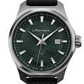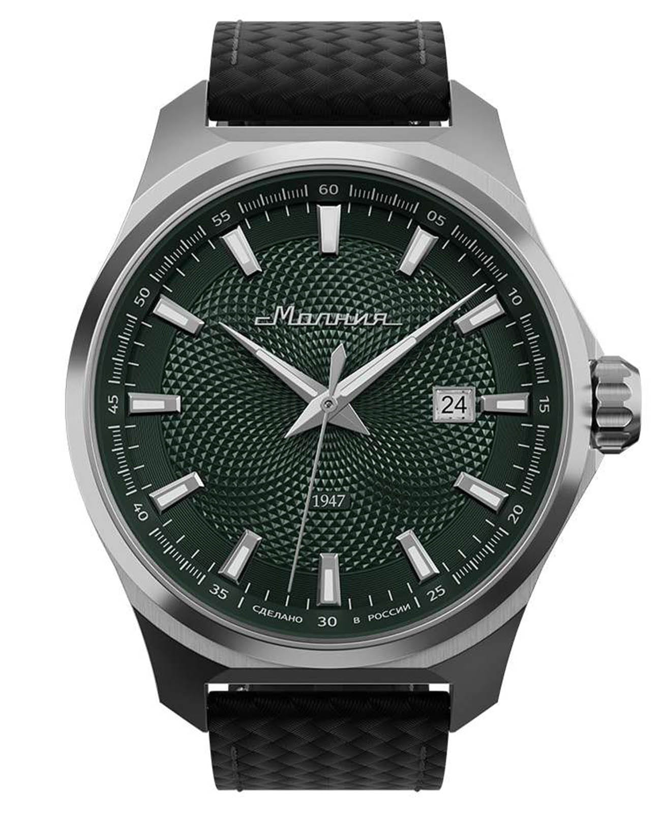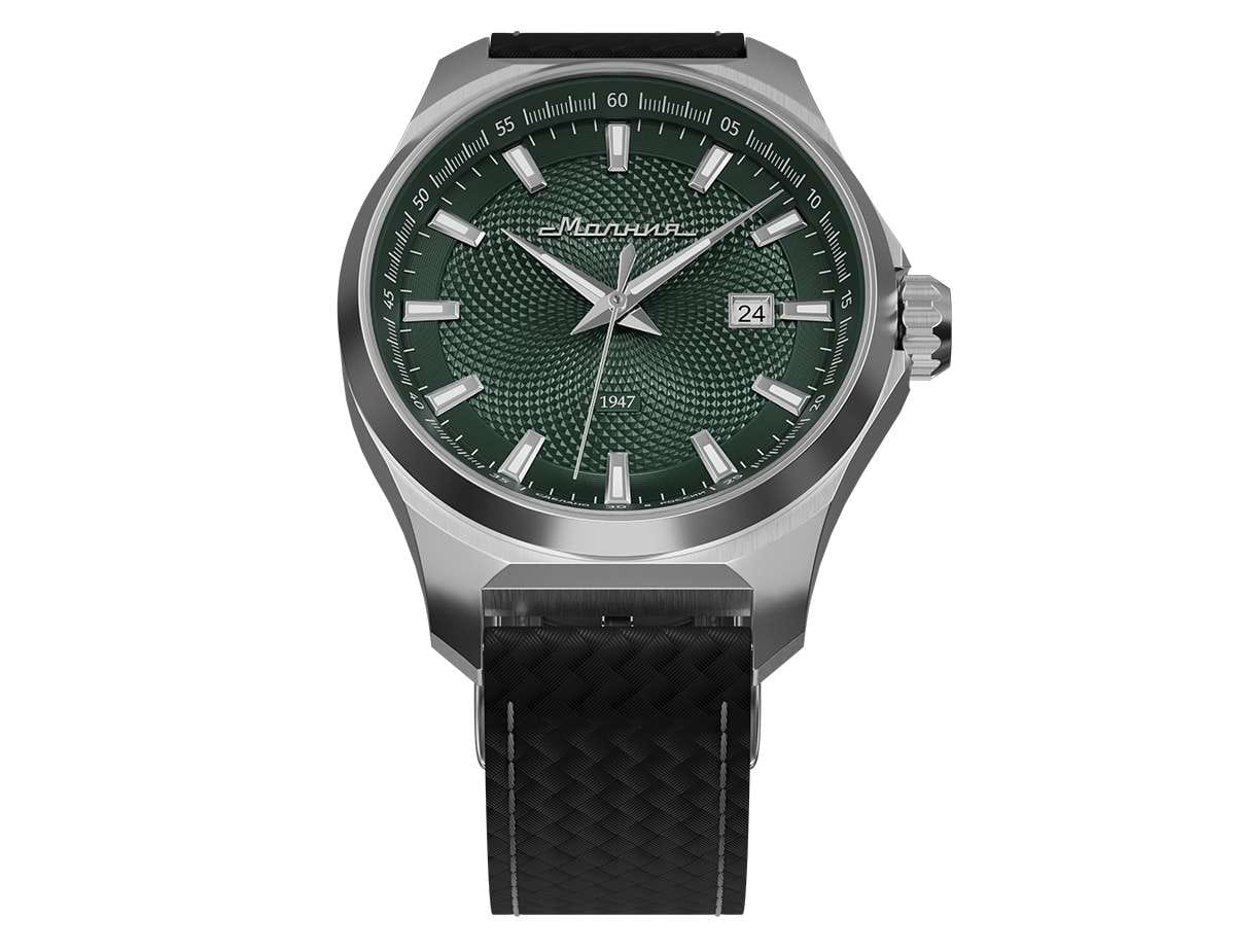Мужские механические часы с автоподзаводом — это надёжный аксессуар от легендарного бренда «МОЛНИЯ», созданный на Челябинском часовом заводе. Корпус диаметром 42 мм выполнен из нержавеющей стали 316L с зеркальной полировкой. БезельБезельВнешний ободок, закрепляющий стекло. В спортивных часах так называется поворотное кольцо с делениями на циферблате, выполняет роль таймера – замеряет отрезки времени на шкале. Неподвижный безель – элемент декора. Однонаправленно вращающийся безель на дайверских часах позволяет фиксировать моменты погружения и выныривания на поверхность. также выполнен из стали с зеркальной отделкой. Циферблат зелёного цвета оформлен индексами и стрелками. Окошко даты расположено в положении 3 часов. Стрелки и метки с люминесцентным покрытиемЛюминесцентное покрытиеПозволяет считывать показания времени в темноте. Производители наносят на стрелки, часовые индексы, безель или поверхность циферблата светонакопительный состав, дающий холодное свечение. Super-LumiNova, обеспечивающим хорошую читаемость в темноте. Циферблат защищён сапфировым стекломСапфировое стеклоПрочный и надёжный материал из кристалла сапфира синтетического происхождения, характеризующийся особой твёрдостью и устойчивостью к царапинам и повреждениям. с антибликовым покрытиемАнтибликовое покрытиеСлой оксида металла в 0,13-0,3 микрон, благодаря которому стекло часов не бликует и не отражает свет. Антибликовое покрытие уменьшает отражение света в 10 раз, обеспечивая отличную читаемость показателей циферблата.. Механизм — японский автоматический калибр Miyota 8215 с функцией и запасом хода до 42 часов. Прозрачная задняя крышка позволяет наблюдать за работой механизма с кастомным ротором. Часы оснащены кожаным ремешком чёрного цвета с подкладкой из фтористого каучука и классической пряжкой, а также системой быстрой замены. Водонепроницаемость 100 м позволяет использовать часы для плавания и повседневного ношения. Идеальный выбор для тех, кто ценит качество, точность и стиль.