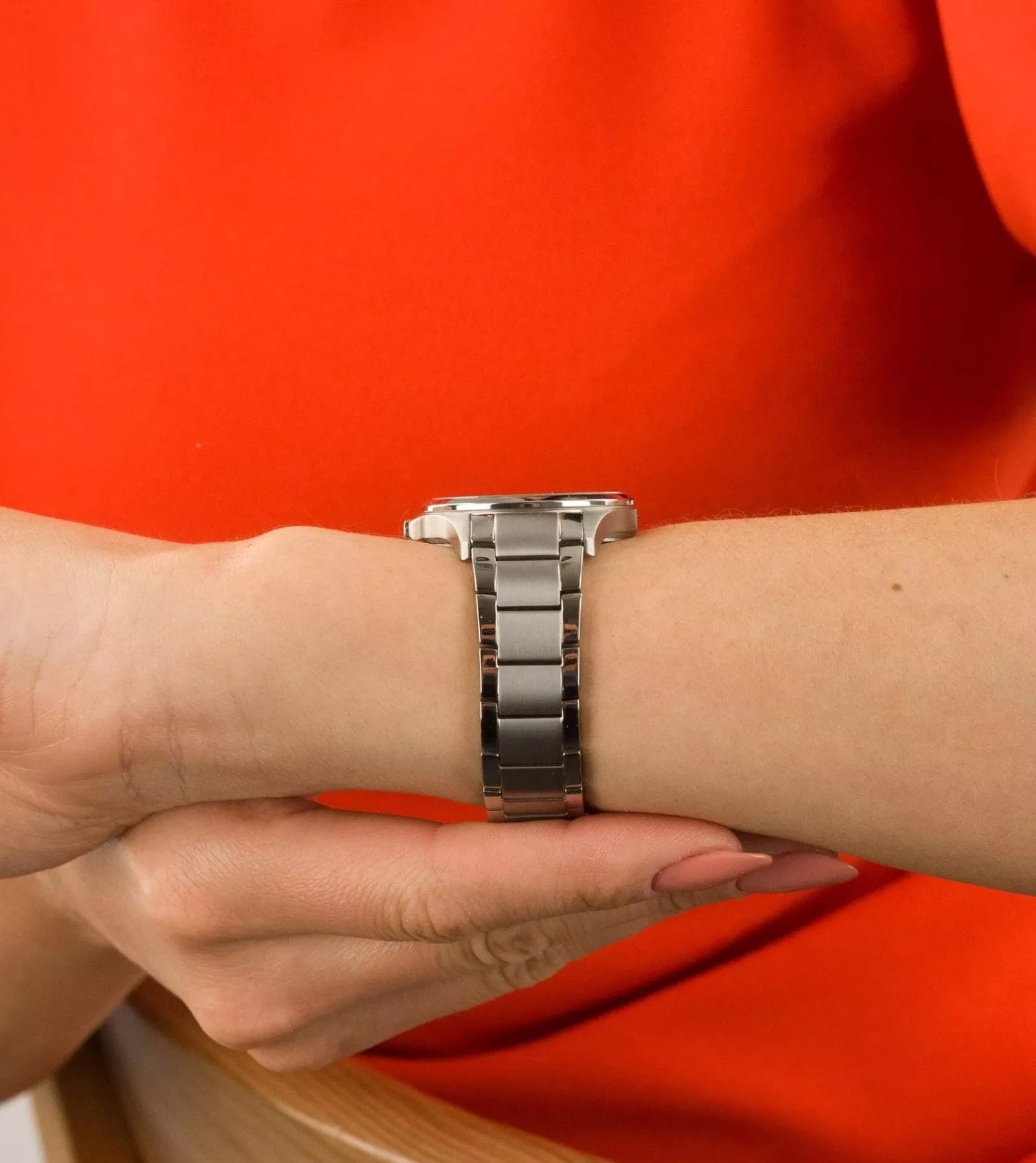 Корпус часов изготовлен из титана. Титановый браслет на раскладной застёжкеРаскладная застёжкаТакой тип застёжки используется только на браслетах из металла. Она никогда не раскрывается полностью, происходит разделение на 2 и более частей. Раскладывающая застёжка снизит вероятность потери часов к минимуму. шириной 18 мм. Заводная головка с защитой. Арабская индикация времени. Окошко даты находятся в положении 3 часа.