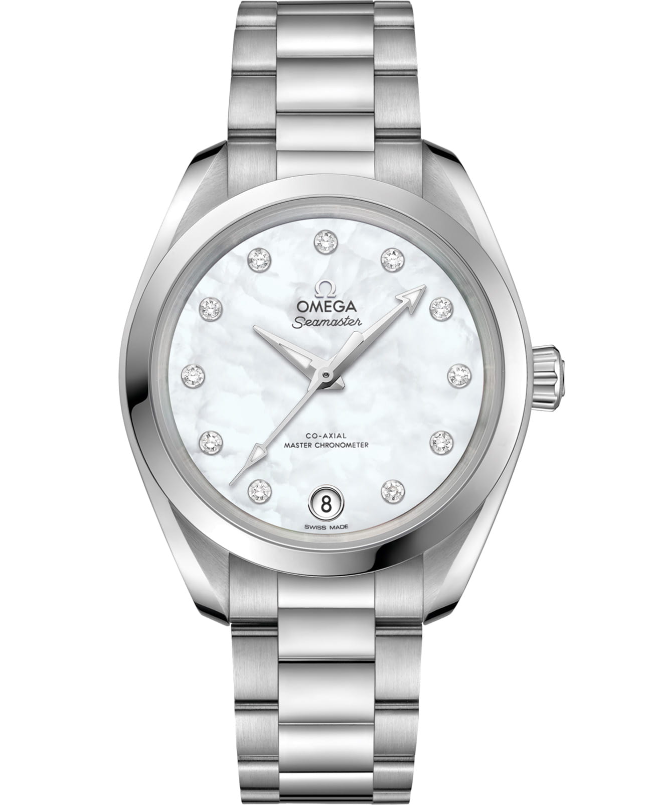 Omega Seamaster Aqua Terra выполнены в симметричном корпусе из нержавеющей стали с завинчивающейся задней крышкой, украшенной волновым узором. Циферблат дополнен окошком даты на 6 часах и 11 бриллиантами, установленными в родиевые держатели — деталь, подчёркивающая женственность и роскошь модели. Циферблат изготовлен из перламутрового материала с переливающейся текстурой, а стрелки и метки выполнены из белого золота. Калибр Omega 8800 сертифицирован как Master Chronometer — гарантия высочайшей точности и устойчивости к магнитным полям. Запас хода составляет 55 часов. Защиту циферблата обеспечивает сапфировое стеклоСапфировое стеклоПрочный и надёжный материал из кристалла сапфира синтетического происхождения, характеризующийся особой твёрдостью и устойчивостью к царапинам и повреждениям. с антибликовым покрытиемАнтибликовое покрытиеСлой оксида металла в 0,13-0,3 микрон, благодаря которому стекло часов не бликует и не отражает свет. Антибликовое покрытие уменьшает отражение света в 10 раз, обеспечивая отличную читаемость показателей циферблата. с обеих сторон. Водозащита позволяет использовать часы в воде без риска повреждения. Часы установлены на интегрированный стальной браслет. Это сочетание премиального качества, технологичности и классического дизайна.
