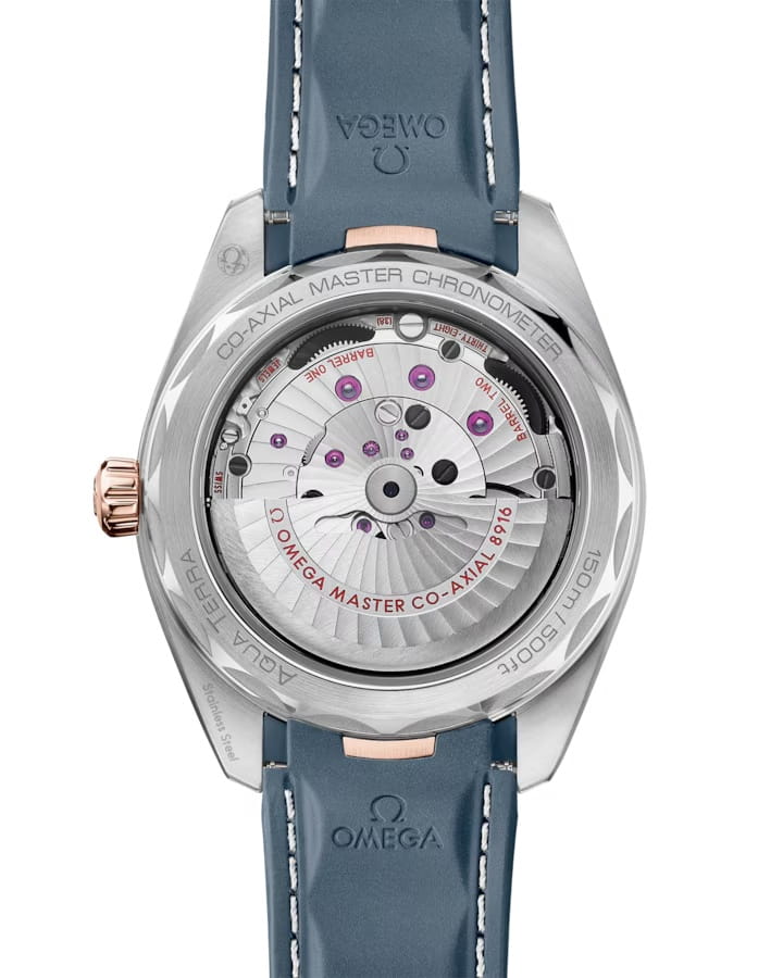 Мужские наручные часы Omega Seamaster Aqua Terra выполнены в корпусе из нержавеющей стали и 18К Sedna™ золота , диаметром 41 мм , толщиной 13,2 мм , ширина между ушками — 20 мм , общий вес составляет около 116 граммов .Циферблат с горизонтальным узором «тиковое дерево» имеет окошко даты в положении 6 часов и дополнительный циферблат малой секундной стрелки с черным кольцом. Стрелки и индексы выполнены из 18К Sedna™ золота и покрыты белым люминесцентным составом Super-LumiNovaЛюминесцентное покрытиеПозволяет считывать показания времени в темноте. Производители наносят на стрелки, часовые индексы, безель или поверхность циферблата светонакопительный состав, дающий холодное свечение., обеспечивающим читаемость в темноте. Минутная шкала и малый циферблат дополнительно обработаны пескоструйным методом для повышения контраста. Стекло — выпуклое сапфировое стекло сапфировое стеклоСапфировое стеклоПрочный и надёжный материал из кристалла сапфира синтетического происхождения, характеризующийся особой твёрдостью и устойчивостью к царапинам и повреждениям. с двусторонним антибликовым покрытием антибликовое покрытиеАнтибликовое покрытиеСлой оксида металла в 0,13-0,3 микрон, благодаря которому стекло часов не бликует и не отражает свет. Антибликовое покрытие уменьшает отражение света в 10 раз, обеспечивая отличную читаемость показателей циферблата., задняя крышка прозрачная, украшена волнообразным узором. Механизм — механический с автоподзаводом , калибр OMEGA Master Chronometer 8916 , сертифицированный METAS и COSC. Обладает запасом хода до 60 часов , антимагнитными свойствами и точностью от 0 до +5 секунд в сутки благодаря коаксиальному спуску и балансу из кремния. Мосты и платина механизма имеют родиевое покрытие и декор Женевские волны. Водозащита — 15 АТМ (150 метров) , что позволяет использовать часы в воде, включая плавание и дайвинг. Часы оснащены каучуковым ремешком с текстурой и серой прошивкой , застёжка — раскладная, с двойной системой блокировки. Это технологичная модель для делового и активного образа жизни, сочетающая морское наследие, швейцарское качество и современные стандарты.