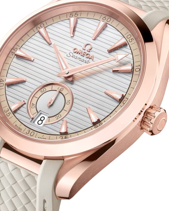 Мужские наручные часы Omega Seamaster Aqua Terra выполнены в корпусе из нержавеющей стали и 18К Sedna™ золота , диаметром 41 мм , толщиной 13,2 мм , ширина между ушками — 20 мм , общий вес составляет около 151 граммов .Циферблат с горизонтальным узором «тиковое дерево» имеет окошко даты в положении 6 часов и дополнительный циферблат малой секундной стрелки с черным кольцом. Стрелки и индексы выполнены из 18К Sedna™ золота и покрыты белым люминесцентным составом Super-LumiNovaЛюминесцентное покрытиеПозволяет считывать показания времени в темноте. Производители наносят на стрелки, часовые индексы, безель или поверхность циферблата светонакопительный состав, дающий холодное свечение., обеспечивающим читаемость в темноте. Минутная шкала и малый циферблат дополнительно обработаны пескоструйным методом для повышения контраста. Стекло — выпуклое сапфировое стекло сапфировое стеклоСапфировое стеклоПрочный и надёжный материал из кристалла сапфира синтетического происхождения, характеризующийся особой твёрдостью и устойчивостью к царапинам и повреждениям. с двусторонним антибликовым покрытием антибликовое покрытиеАнтибликовое покрытиеСлой оксида металла в 0,13-0,3 микрон, благодаря которому стекло часов не бликует и не отражает свет. Антибликовое покрытие уменьшает отражение света в 10 раз, обеспечивая отличную читаемость показателей циферблата., задняя крышка прозрачная, украшена волнообразным узором. Механизм — механический с автоподзаводом , калибр OMEGA Master Chronometer 8917, сертифицированный METAS и COSC. Обладает запасом хода до 60 часов , антимагнитными свойствами и точностью от 0 до +5 секунд в сутки благодаря коаксиальному спуску и балансу из кремния. Мосты и платина механизма имеют родиевое покрытие и декор Женевские волны. Водозащита — 15 АТМ (150 метров) , что позволяет использовать часы в воде, включая плавание и дайвинг. Часы оснащены каучуковым ремешком, застёжка — раскладная, с двойной системой блокировки. Это технологичная модель для делового и активного образа жизни, сочетающая морское наследие, швейцарское качество и современные стандарты.