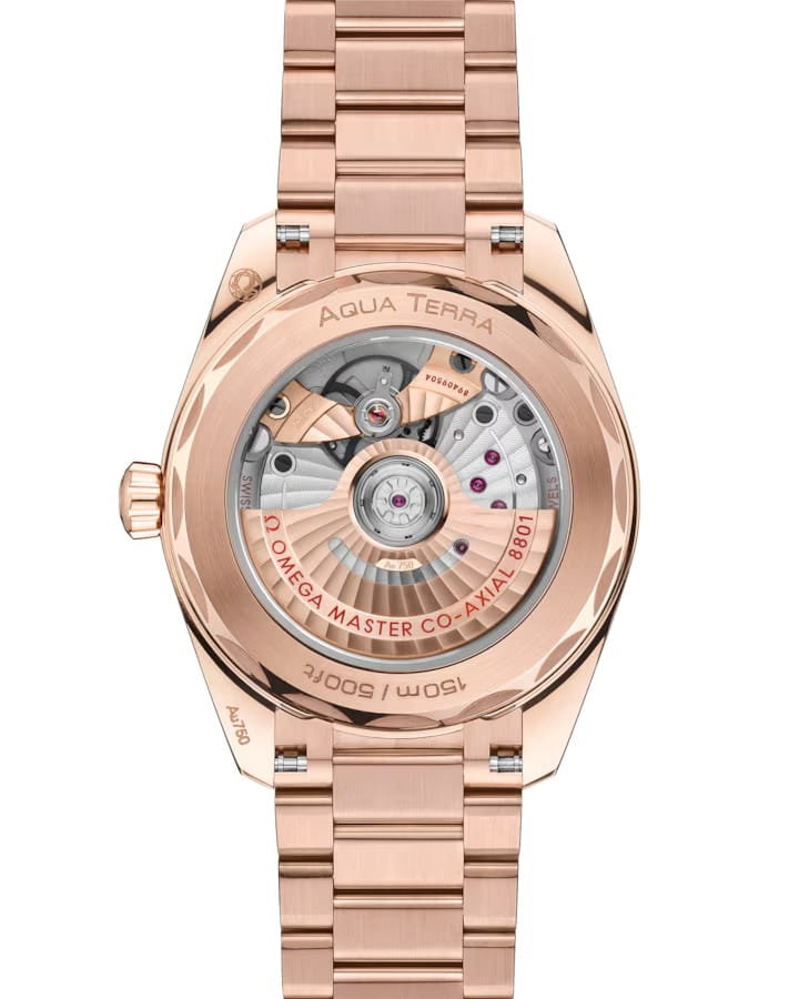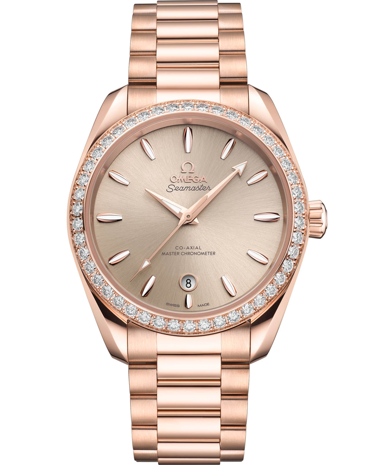 Omega Seamaster Aqua Terra выполнены в симметричном корпусе из полированного 18K Sedna™ золота с завинчивающейся задней крышкой, украшенной волновым узором. Безель инкрустирован бриллиантами, что добавляет модели роскошный акцент. Циферблат дополнен окошком даты на 6 часах, окаймлённым кольцом из 18K Sedna™ золота. Поверхность циферблата обработана методом CVD и имеет песочный оттенок с серыми вставками. Стрелки и метки выполнены из 18K Sedna™ золота и оснащены люминесцентным покрытиемЛюминесцентное покрытиеПозволяет считывать показания времени в темноте. Производители наносят на стрелки, часовые индексы, безель или поверхность циферблата светонакопительный состав, дающий холодное свечение. Super-LumiNova для лучшей читаемости в темноте. Индексы выполнены в форме корпусов парусников — деталь, подчёркивающая морское наследие коллекции. Калибр Omega 8801 сертифицирован как Master Chronometer — гарантия высочайшей точности и устойчивости к магнитным полям. Запас хода составляет 55 часов. Защиту циферблата обеспечивает сапфировое стеклоСапфировое стеклоПрочный и надёжный материал из кристалла сапфира синтетического происхождения, характеризующийся особой твёрдостью и устойчивостью к царапинам и повреждениям. с антибликовым покрытиемАнтибликовое покрытиеСлой оксида металла в 0,13-0,3 микрон, благодаря которому стекло часов не бликует и не отражает свет. Антибликовое покрытие уменьшает отражение света в 10 раз, обеспечивая отличную читаемость показателей циферблата. с обеих сторон. Водозащита позволяет использовать часы в воде без риска повреждения. Часы установлены на браслет из 18K Sedna™ золота с застёжкой-бабочкой с кнопкамиЗастёжка "бабочка"Такой вид застёжки дополняется предохранителями, помогающими избежать случайного раскрытия браслета. Обладают изящным исполнением. и закруглёнными звеньями. Это сочетание премиального качества, технологичности и классического дизайна.