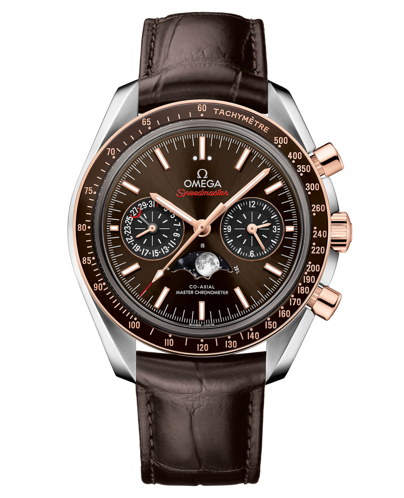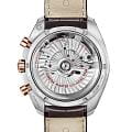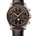 , создавая теплую гармонию оттенков. На "6 часах" расположен уникальный указатель фаз Луны - металлизированный хрустальный диск с детальным изображением лунной поверхности. Коричневый кожаный ремешок с раскладывающейся застежкой дополняет образ, а калибр OMEGA Co-Axial Master Chronometer 9904 с сертификатом METAS гарантирует точность, достойную космического наследия Speedmaster.