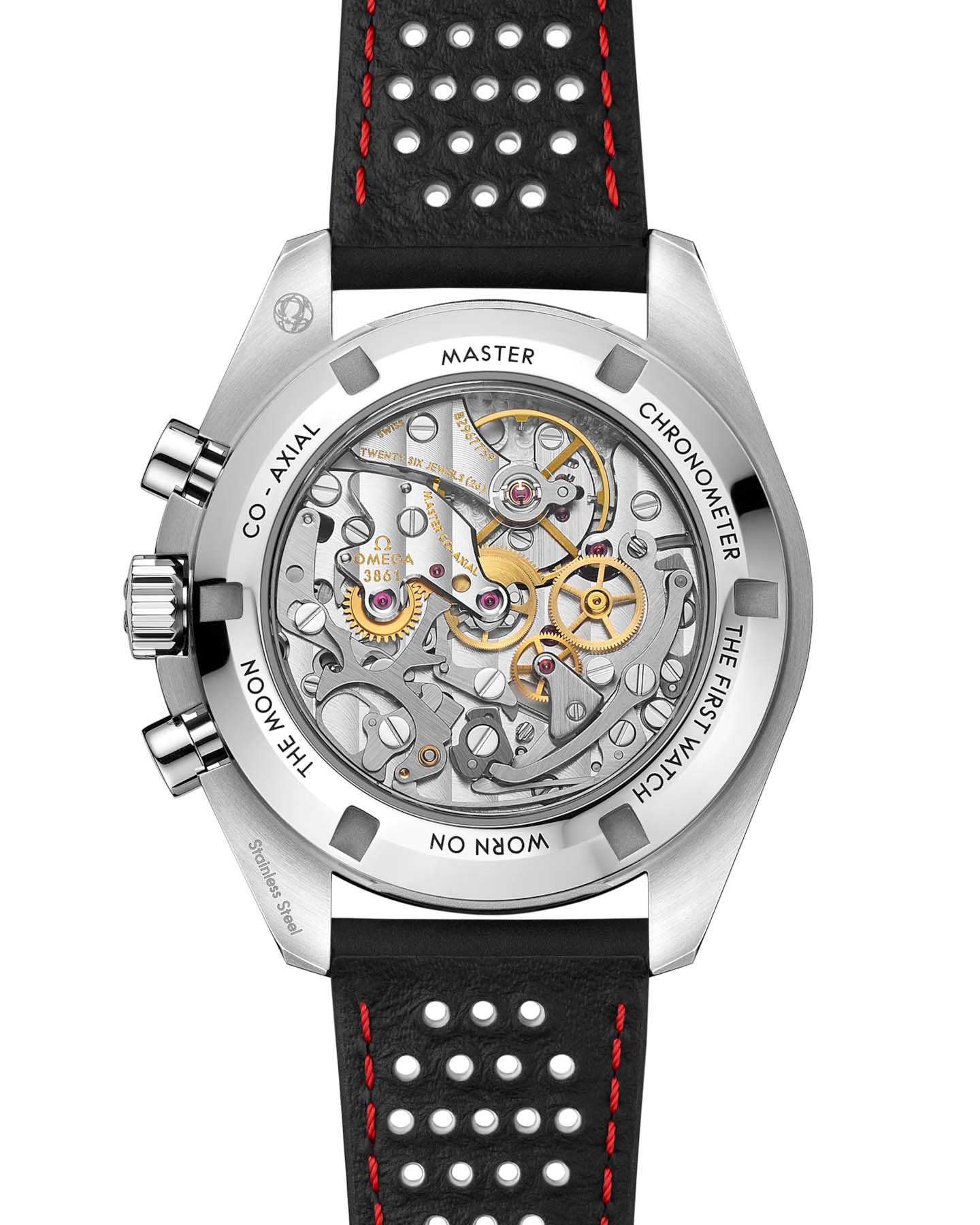 Легендарные Speedmaster Moonwatch – настоящая икона часового искусства. Шесть путешествий на Луну превратили эти часы в символ смелости и инноваций OMEGA. Moonwatch представлены в 42-миллиметровом корпусе из нержавеющей стали с сапфировыми стекламиСапфировое стеклоПрочный и надёжный материал из кристалла сапфира синтетического происхождения, характеризующийся особой твёрдостью и устойчивостью к царапинам и повреждениям. спереди и сзади. Их дизайн вдохновлен четвертым поколением лунных Speedmaster. Асимметричный корпус сочетается с белым лакированным циферблатом, украшенным многоуровневыми индексами и фирменным логотипом OMEGA. Характерные стрелки в стиле Moonwatch и классическая точка у отметки "90" на безелеБезельВнешний ободок, закрепляющий стекло. В спортивных часах так называется поворотное кольцо с делениями на циферблате, выполняет роль таймера – замеряет отрезки времени на шкале. Неподвижный безель – элемент декора. Однонаправленно вращающийся безель на дайверских часах позволяет фиксировать моменты погружения и выныривания на поверхность. из черного анодированного алюминия подчеркивают их аутентичность. Модель дополнена стильным черным кожаным ремешком с микроперфорацией и контрастной красно-белой строчкой. В сердце часов бьется механизм OMEGA Co-Axial Master Chronometer 3861, отвечающий за работу малой секундной стрелки, 30-минутного и 12-часового счетчиков, а также центральной хронографнойХронографФункция позволяет измерять отрезки времени с особой точностью: часы, минуты, секунды. Верным признаком хронографа является наличие на циферблате 3 дополнительных окошек-счётчиков. стрелки.