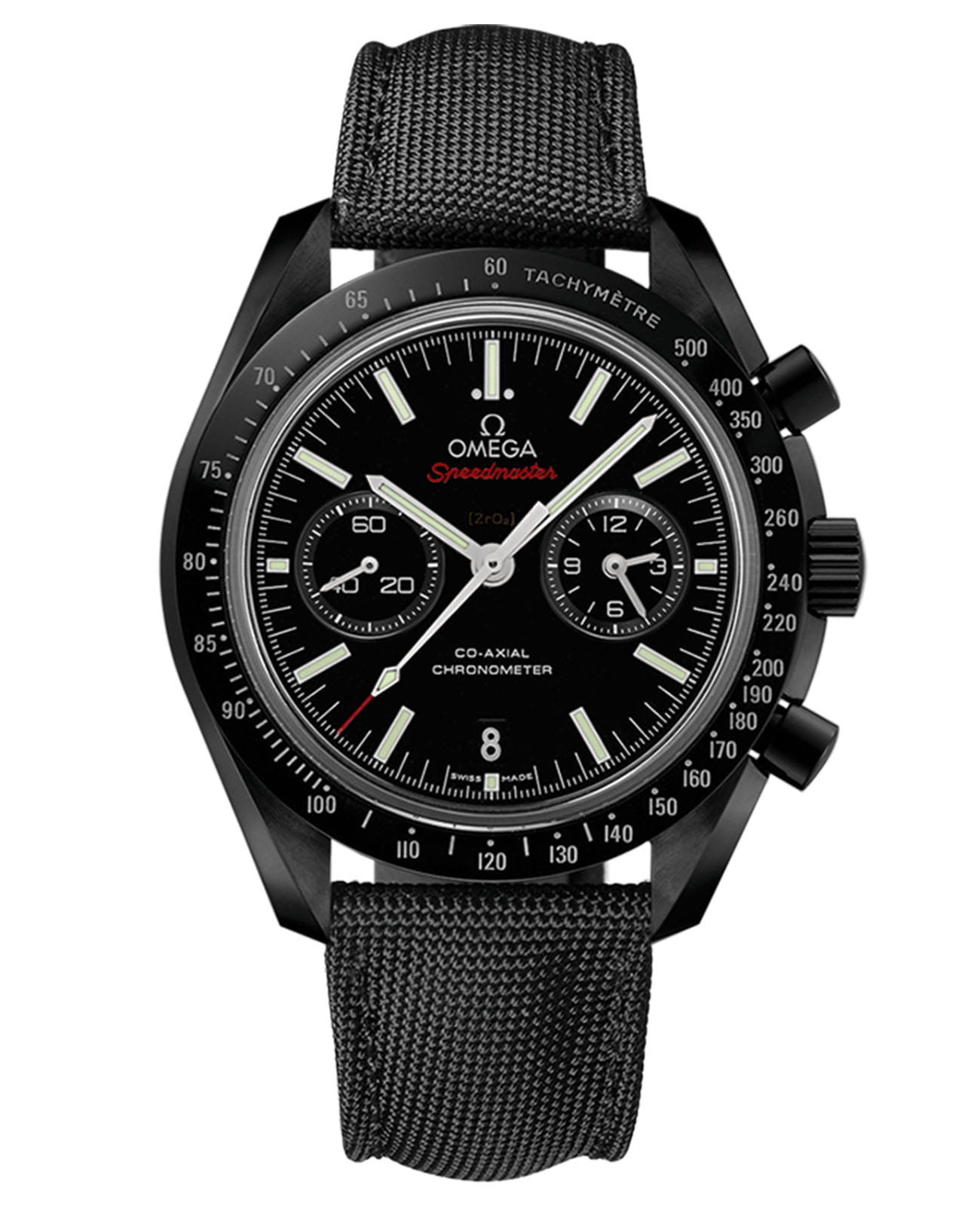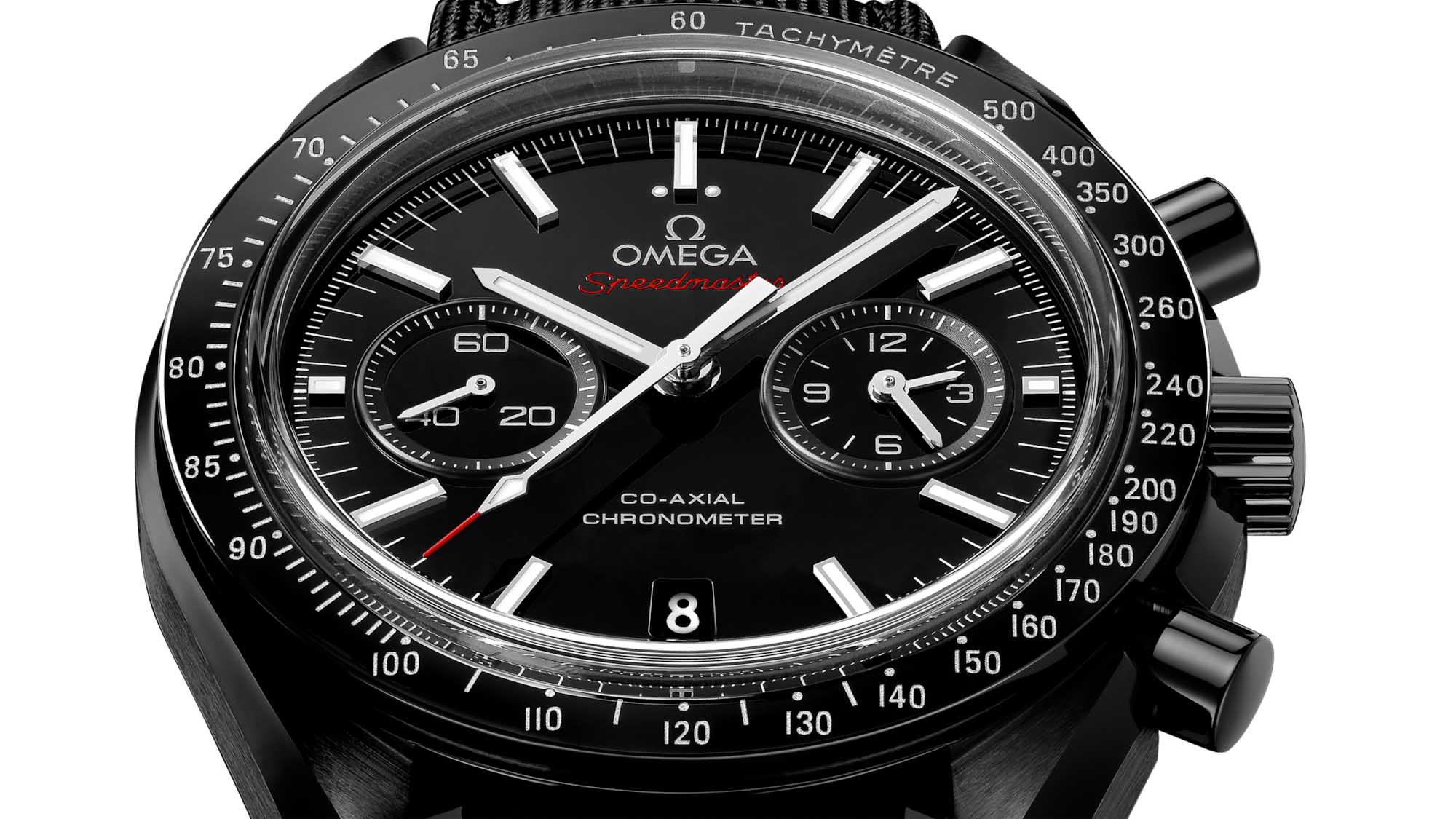 Speedmaster Dark Side of the Moon — завораживающая космическая интерпретация легендарных Moonwatch, будто созданная из самой тьмы Вселенной. 44,25-мм монокорпус из керамики с сатинированным керамическим безелемБезельВнешний ободок, закрепляющий стекло. В спортивных часах так называется поворотное кольцо с делениями на циферблате, выполняет роль таймера – замеряет отрезки времени на шкале. Неподвижный безель – элемент декора. Однонаправленно вращающийся безель на дайверских часах позволяет фиксировать моменты погружения и выныривания на поверхность. демонстрирует тахиметрическую шкалуТахиметрРазмеченная шкала, располагается на ободке или безеле часов. Тахиметр позволяет рассчитать скорость на определённом участке пути, расстояние измеряется в километрах или милях. в матовом нитрид-хромовом исполнении. На угольно-черном керамическом циферблате эффектно контрастируют чернёные кольца субсчетчиков (на 3 и 9 часах) с накладными индексами из 18-каратного белого золота18-каратное золотоОбозначение по каратной системе пробирования, оно показывает, сколько драгоценного металла содержится в изделии. 18 карат - в составе 75% чистого золота, соответствует 750 пробе.