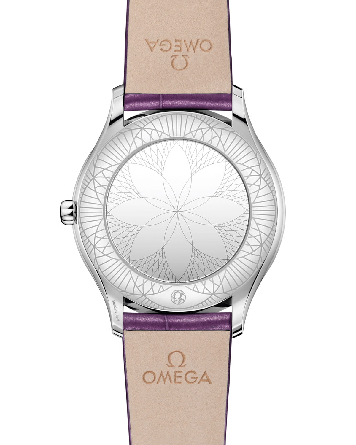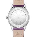 OMEGA Trésor с цветочным очарованием — это гармония роскоши и природной грации. 36-мм корпус из полированной стали, усыпанный 38 бриллиантами (0,49 карата), напоминает утреннюю росу на лепестках. Под сапфировым стекломСапфировое стеклоПрочный и надёжный материал из кристалла сапфира синтетического происхождения, характеризующийся особой твёрдостью и устойчивостью к царапинам и повреждениям. раскрывается циферблат с пурпурным PVD-покрытиемPVDУльтратонкое покрытие наносится в технике вакуумного напыления, сочетает в себе нитрид титана особой прочности со слоем золота или оксида хрома. Несёт в себе декоративную или защитную функцию., украшенный изящным лазерным узором пиона — символа процветания. Заводная головка с бриллиантом и родиевые элементы придают благородный блеск. Пурпурный кожаный ремешок с металлической застежкой завершает образ, а зеркальная крышка с узором "Her Time" скрывает точный механизм OMEGA 4061.