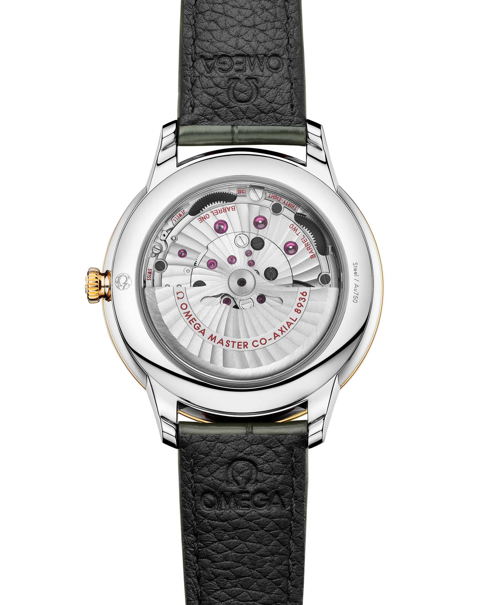 обрамляет завораживающий циферблат с зеленым PVD-покрытиемPVDУльтратонкое покрытие наносится в технике вакуумного напыления, сочетает в себе нитрид титана особой прочности со слоем золота или оксида хрома. Несёт в себе декоративную или защитную функцию. и солнечным узором. Минутная шкала "железная дорога" гармонично сочетается с чередующимися римскими цифрами и кабошонами, создавая игру света. Индикатор даты с сатинированным кольцом и стрелкой из желтого золота с полумесяцем добавляет функциональную изысканность. Зеленый кожаный ремешок завершает образ, а сапфировое стеклоСапфировое стеклоПрочный и надёжный материал из кристалла сапфира синтетического происхождения, характеризующийся особой твёрдостью и устойчивостью к царапинам и повреждениям. задней крышки раскрывает взору калибр Co-Axial Master Chronometer 8936 — символ часового совершенства.