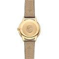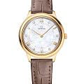 грациозно соседствуют с чередующимися римскими цифрами и бриллиантовыми метками. Лаконичный дизайн дополнен изящной минутной шкалой в виде точечных маркеров и задней крышкой с рельефным медальоном, изображающим бога времени Хроноса. Часы представлены с переливающимся кожаным ремешком серо-коричневого оттенка и оснащены кварцевым механизмом OMEGA 4061, гарантирующим точность хода на протяжении не менее 48 месяцев.