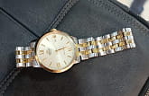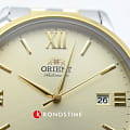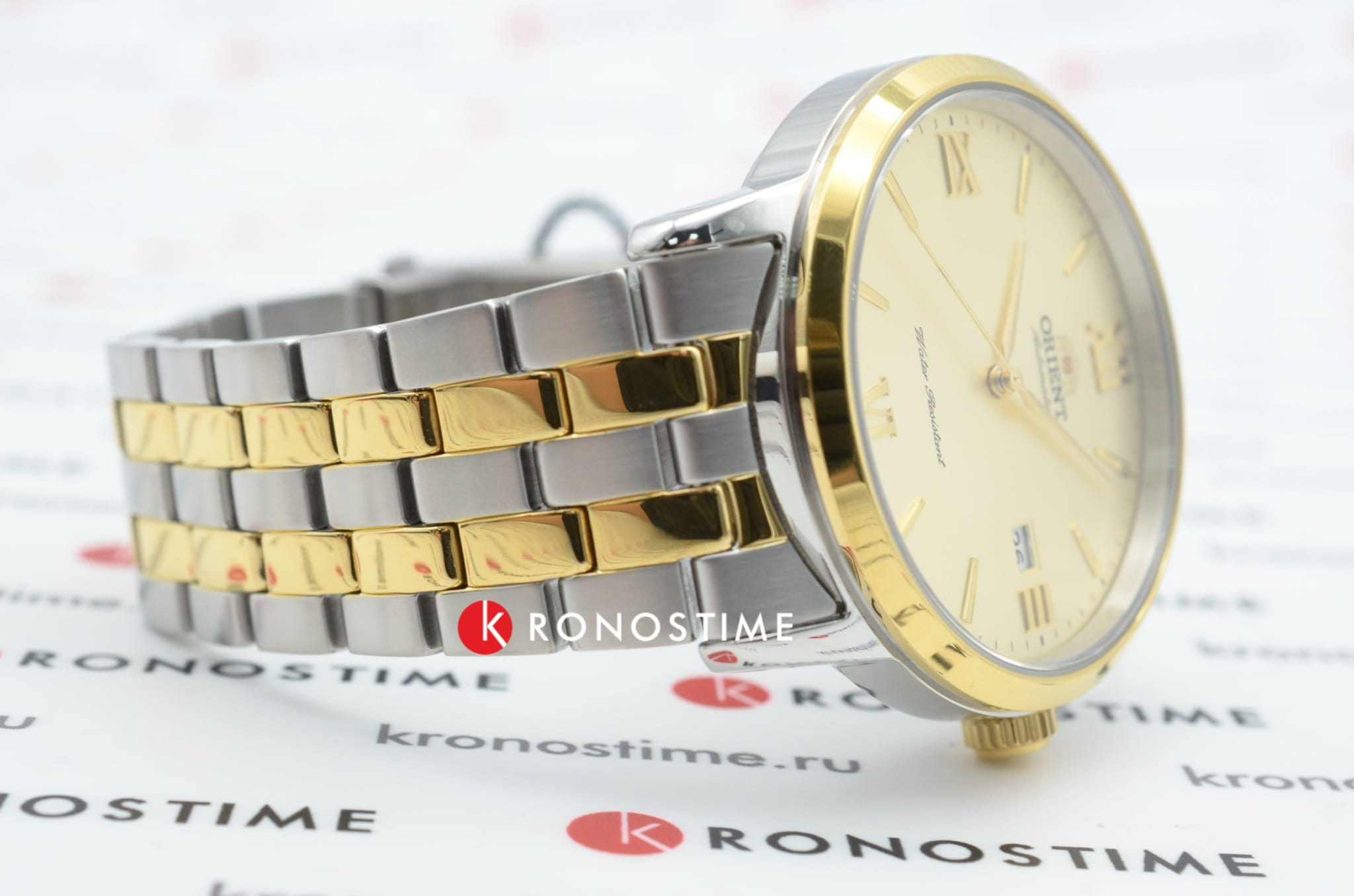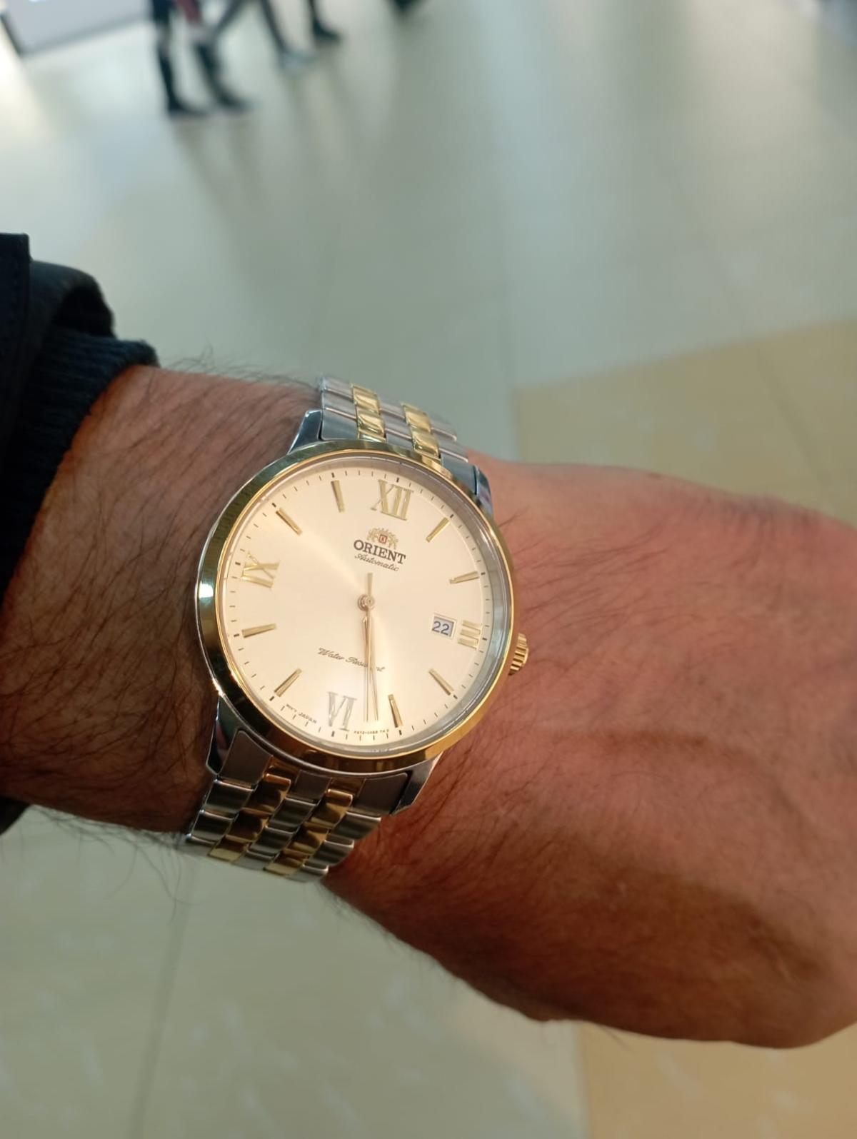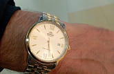 Часы Orient RA-AC0F08G — элегантная модель из коллекции Contemporary, объединяющая классический стиль и современные технологии. Корпус диаметром 41,6 мм выполнен из нержавеющей стали с золотистым фиксированным безелемБезельВнешний ободок, закрепляющий стекло. В спортивных часах так называется поворотное кольцо с делениями на циферблате, выполняет роль таймера – замеряет отрезки времени на шкале. Неподвижный безель – элемент декора. Однонаправленно вращающийся безель на дайверских часах позволяет фиксировать моменты погружения и выныривания на поверхность., подчёркивающим утончённый дизайн. Шампань-циферблат украшен золотистыми стрелками и часовыми метками, дополненными римскими цифрами на позициях 3, 6, 9 и 12 часов. Сапфировое стеклоСапфировое стеклоПрочный и надёжный материал из кристалла сапфира синтетического происхождения, характеризующийся особой твёрдостью и устойчивостью к царапинам и повреждениям. обеспечивает защиту от царапин, сохраняя идеальный внешний вид. Часы оснащены автоматическим механизмом Orient Calibre F6722 с функцией ручного завода и остановки секундной стрелки, что гарантирует точность и удобство использования. На отметке «3 часа» расположено окошко даты, добавляющее практичности. Двухцветный браслет из нержавеющей стали с раскладной застёжкойРаскладная застёжкаТакой тип застёжки используется только на браслетах из металла. Она никогда не раскрывается полностью, происходит разделение на 2 и более частей. Раскладывающая застёжка снизит вероятность потери часов к минимуму. сочетает комфорт и стиль. Водонепроницаемость до 50 метров делает часы подходящими для повседневного использования. Orient RA-AC0F08G — это утончённый аксессуар для тех, кто ценит японское качество и элегантность.
