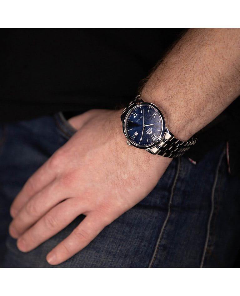 Мужские механические часы Orient RA-AC0F09L1 — это утончённый классический аксессуар, который идеально дополнит деловой образ. Модель оснащена калибром F6722 с автоподзаводом и возможностью ручной подзаводки. Механизм имеет 22 драгоценных камня и обеспечивает запас хода до 40 часов. Также реализована функция стоп-секунды для точной установки времени. Циферблат синего цвета выполнен по технологии Sunray, создающей эффект расходящихся солнечных лучей. Метки представлены в виде штрихов и римских цифр, а информация о дате вынесена в окошко на отметке 3 часов. Защиту циферблата обеспечивает сапфировое стеклоСапфировое стеклоПрочный и надёжный материал из кристалла сапфира синтетического происхождения, характеризующийся особой твёрдостью и устойчивостью к царапинам и повреждениям., устойчивое к царапинам и повреждениям. Корпус диаметром 41 мм изготовлен из нержавеющей стали, а задняя крышка — завинчивающаяся и прозрачная, что позволяет рассмотреть работу механизма и подчёркивает внимание к деталям внутренней отделки. Рифлёная заводная головка обеспечивает удобство настройки времени и дополнительный элемент стиля. Браслет выполнен из стали и оснащён раскладной застёжкойРаскладная застёжкаТакой тип застёжки используется только на браслетах из металла. Она никогда не раскрывается полностью, происходит разделение на 2 и более частей. Раскладывающая застёжка снизит вероятность потери часов к минимуму., обеспечивающей комфорт и уверенную фиксацию на запястье. Ширина браслета составляет 22 мм, что делает его гармонично сочетающимся с корпусом. Часы водонепроницаемы до 50 метров (), что позволяет использовать их в повседневных условиях — при мытье рук или под лёгким дождём. Эти часы станут универсальным аксессуаром для тех, кто ценит сочетание традиций, точности и эстетики — идеальный выбор для повседневной носки и торжественных случаев.