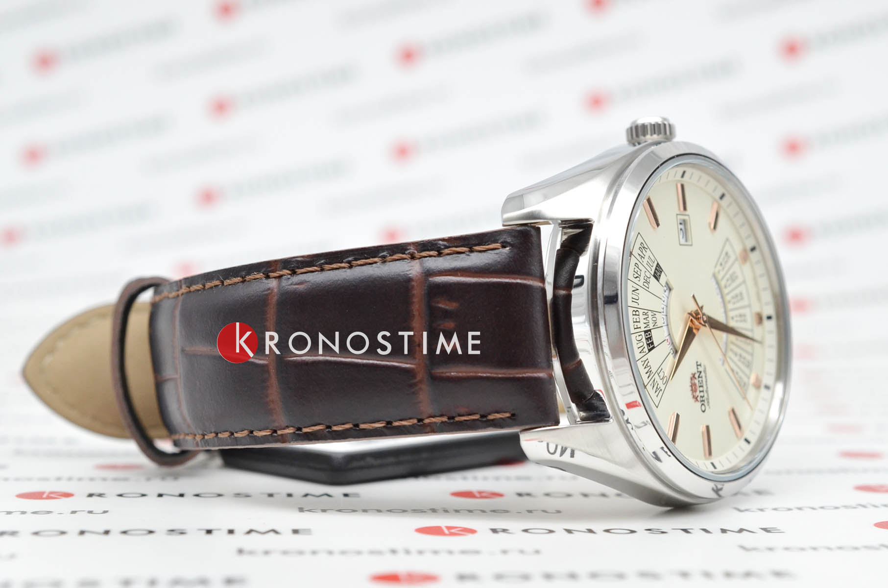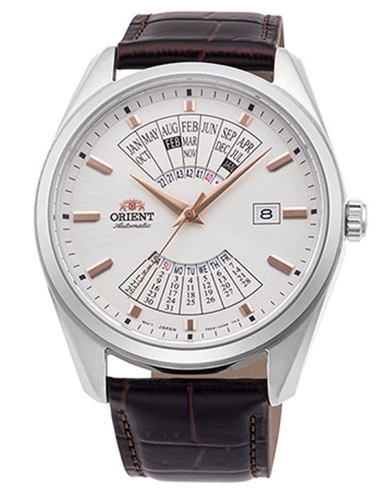 Orient RA‑BA0005S Multi‑Year Calendar — элегантная модель с выразительным дизайном и практичной функциональностью. Корпус диаметром 43,5 мм выполнен из нержавеющей стали с полированной поверхностью, придающей часам сдержанный и благородный облик.