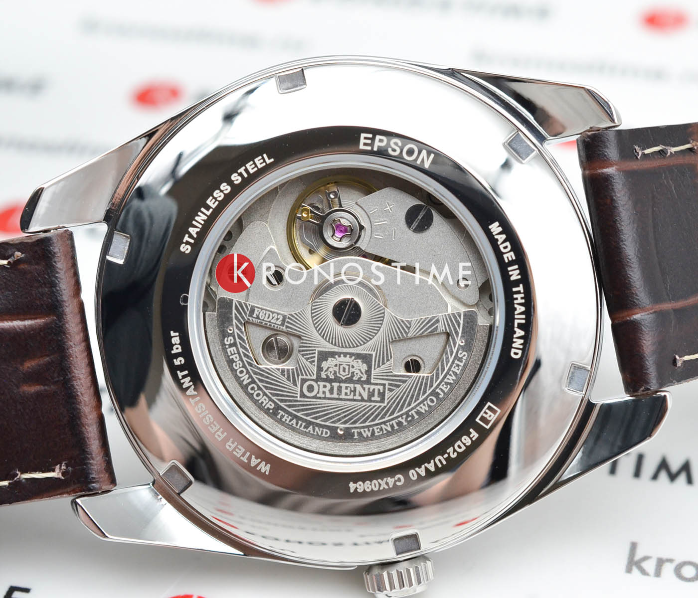 Циферблат защищён устойчивым к царапинам минеральным стекломМинеральное стеклоМинеральное стекло представляет собой искусственно выращенный минерал кварца. Такое стекло отличается особой устойчивостью к повреждениям и царапинам. Уступает по некоторым качествам сапфировому стеклу., которое сохраняет отличную читаемость. Задняя крышка прозрачная — позволяет наблюдать за работой автоматического механизма F6D22 с ручным заводом, функцией остановки секундной стрелки и запасом хода около 40 часов.
