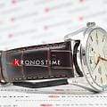 Циферблат светло-серебристого оттенка оформлен в стиле многофункционального календаря: верхняя часть отображает месяцы и года, нижняя — дни недели и числа, а также выделено отдельное окошко даты у отметки «3 часа». Все элементы расположены чётко и удобно для визуального восприятия. Объёмные стрелки и часовые метки подчёркивают классический стиль.