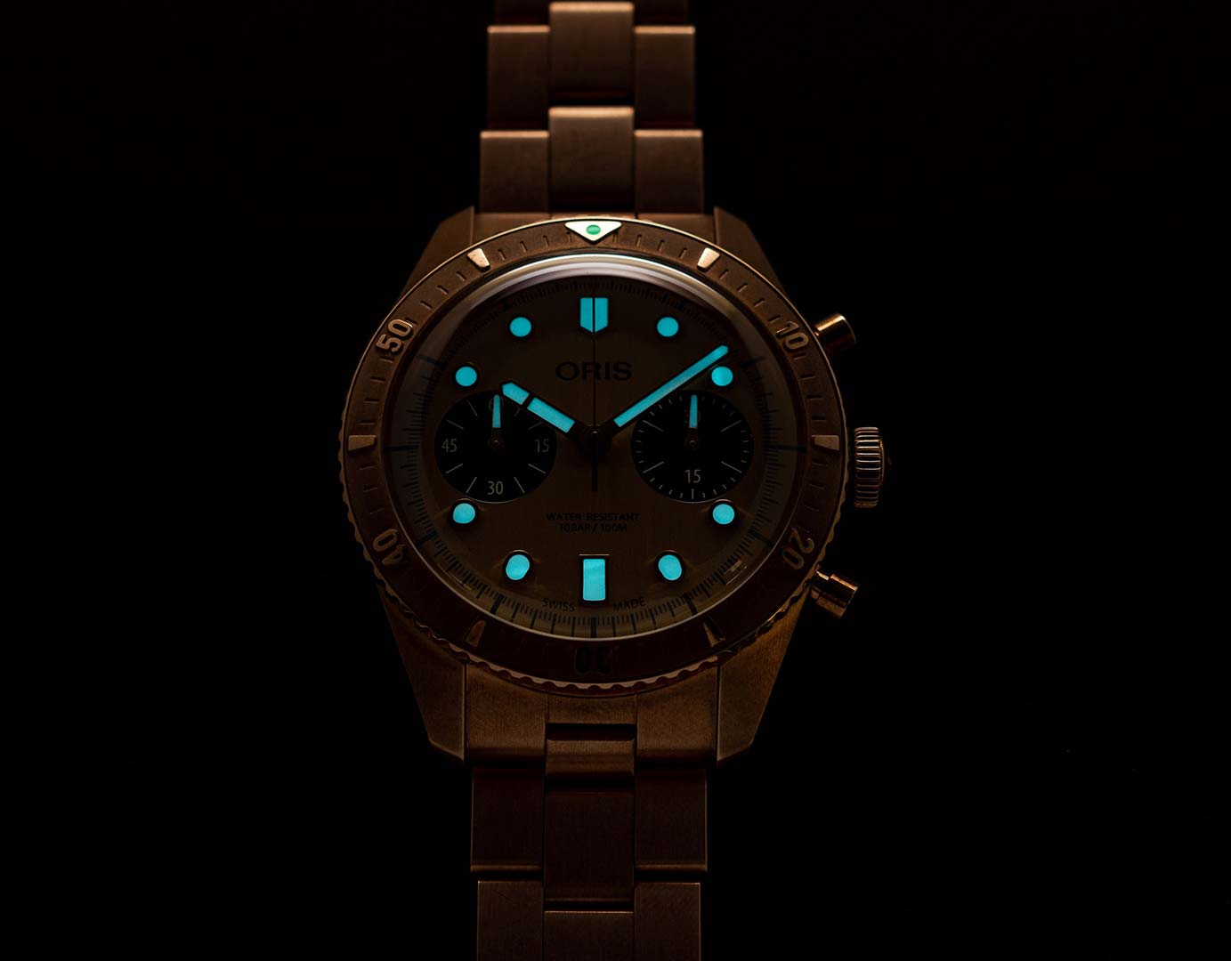 Стрелки и индексы покрыты составом Super-LumiNova, люминесцентное покрытиеЛюминесцентное покрытиеПозволяет считывать показания времени в темноте. Производители наносят на стрелки, часовые индексы, безель или поверхность циферблата светонакопительный состав, дающий холодное свечение., что обеспечивает превосходную видимость в темноте. Вращающийся в одном направлении безель с минутной шкалой добавляет функциональности для подводных погружений.
