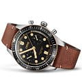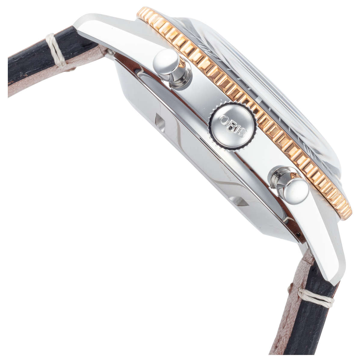 Швейцарские мужские часы ORIS DIVERS SIXTY-FIVE — это воплощение классического дизайна ретро-дайверских часов с современными технологиями. Модель 01 771 7744 4354-07 8 21 18 из коллекции Divers Sixty-Five создана для тех, кто ценит уникальность, точность и надежность. Корпус диаметром 43 мм выполнен из многокомпонентного материала: сочетания бронзы и нержавеющей стали, что придает часам не только прочность, но и особый винтажный шарм. Поворотный ободок с минутной шкалой помогает точно отслеживать продолжительность погружений. Циферблат защищен выпуклым сапфировое стеклоСапфировое стеклоПрочный и надёжный материал из кристалла сапфира синтетического происхождения, характеризующийся особой твёрдостью и устойчивостью к царапинам и повреждениям. с антибликовым покрытиемАнтибликовое покрытиеСлой оксида металла в 0,13-0,3 микрон, благодаря которому стекло часов не бликует и не отражает свет. Антибликовое покрытие уменьшает отражение света в 10 раз, обеспечивая отличную читаемость показателей циферблата., обеспечивающим отличную читаемость показаний даже при ярком освещении. Механизм Oris 771 (на базе SW 510) — это автоматический механизм с автоподзаводом, работающий от движения руки. Запас хода составляет 48 часов. Часы оснащены функциями хронографаХронографФункция позволяет измерять отрезки времени с особой точностью: часы, минуты, секунды. Верным признаком хронографа является наличие на циферблате 3 дополнительных окошек-счётчиков.: центральная секундная стрелка хронографа с шагом в 1/4 секунды, два дополнительных циферблата с маленькой секундной стрелкой постоянного вращения и 30-минутным счетчиком. Также предусмотрена функция коррекции даты и остановка секундной стрелки при подводке времени. Стрелки и индексы покрыты составом Super-LumiNova, люминесцентное покрытиеЛюминесцентное покрытиеПозволяет считывать показания времени в темноте. Производители наносят на стрелки, часовые индексы, безель или поверхность циферблата светонакопительный состав, дающий холодное свечение., что обеспечивает превосходную видимость в темноте. Вращающийся в одном направлении безель с минутной шкалой добавляет функциональности для подводных погружений. Кожаный ремешок на стандартной застёжке. Завинчивающаяся задняя крышка из нержавеющей стали с специальной гравировкой и завинчивающаяся заводная головка обеспечивают водонепроницаемость до 10 бар (WR100), что делает эти часы идеальными для плавания и других водных видов спорта.