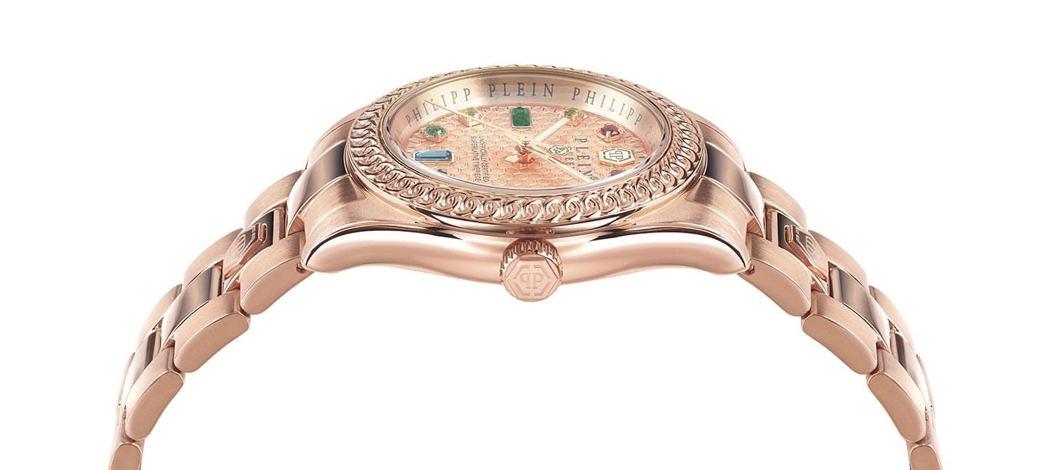 Часы Philipp Plein Queen PWCAA0821 отличаются утончённым дизайном и высококачественными материалами. Корпус из нержавеющей стали с IP-покрытиемIP-покрытиеМетод ионного напыления. Демонстрирует повышенную устойчивость к истиранию, окислению и химическим веществам. Под воздействием высокого давления и температуры около 1500°C молекулы металла надёжно соединяются с частицами корпуса часов. обеспечивает элегантный вид и стойкость к износу. Зелёный циферблат украшен кристаллами Swarovski и фирменным логотипом бренда в виде черепа на отметке 12 часов.
