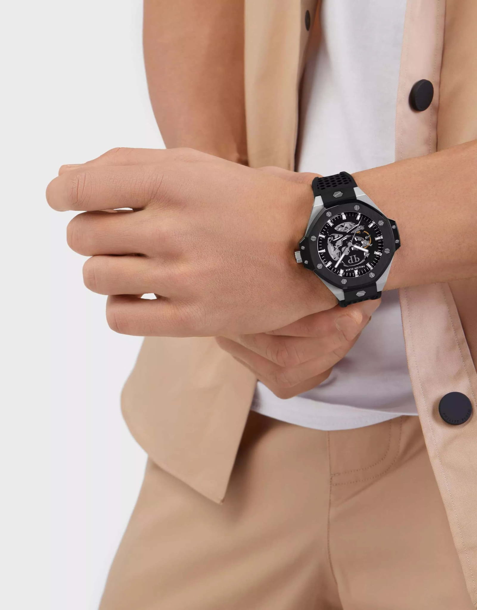 Эти бесподобные часы в стильном дизайне с точным и надежным механизмом завораживают своим корпусом геометричной формы и культовыми элементами бренда и без сомнений сделают мужской образ еще более харизматичным и брутальным. Скелетонизированные мужские механические часы с автоподзаводом. Необычный стальной корпус c частично сатинированной и полированной поверхностью. Циферблат декорирован логотипом бренда в положении 12 часов и изображением черепа с костями. Метки в виде штрихов. Минеральное стеклоМинеральное стеклоМинеральное стекло представляет собой искусственно выращенный минерал кварца. Такое стекло отличается особой устойчивостью к повреждениям и царапинам. Уступает по некоторым качествам сапфировому стеклу. устойчивое к мелким механическим повреждениям. Стрелки и метки с люминесцентным покрытиемЛюминесцентное покрытиеПозволяет считывать показания времени в темноте. Производители наносят на стрелки, часовые индексы, безель или поверхность циферблата светонакопительный состав, дающий холодное свечение.. Граненая заводная головка. На задней крышке имеется прозрачное окошко, через которое можно наблюдать работу механизма часов. Черный перфорированный силиконовый ремешок с классической застежкой и шестиугольным логотипом бренда. Фирменная дизайнерская упаковка.