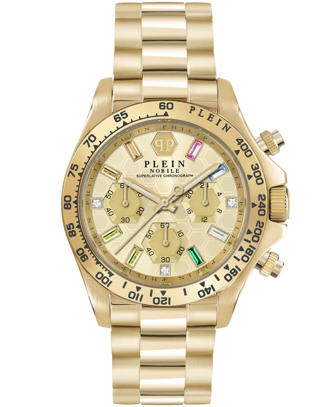 Яркие женские часы-хронографХронографФункция позволяет измерять отрезки времени с особой точностью: часы, минуты, секунды. Верным признаком хронографа является наличие на циферблате 3 дополнительных окошек-счётчиков. с секундомеромСекундомерСекундоме́р — прибор, способный измерять интервалы времени с точностью до долей секунды. Philipp Plein Nobile Lady PWSBA0223, кварцевый механизм с высокой точностью. 12 и 24-часовой формат времени. Класс водозащиты: 50 метров, позволит защитить корпус от случайных брызг или капель дождя. Корпус и браслет часов изготовлены из стали с IP-покрытиемIP-покрытиеМетод ионного напыления. Демонстрирует повышенную устойчивость к истиранию, окислению и химическим веществам. Под воздействием высокого давления и температуры около 1500°C молекулы металла надёжно соединяются с частицами корпуса часов.. Стрелки с люминесцентным покрытиемЛюминесцентное покрытиеПозволяет считывать показания времени в темноте. Производители наносят на стрелки, часовые индексы, безель или поверхность циферблата светонакопительный состав, дающий холодное свечение.. Стальной браслет на застёжке-бабочке с кнопкамиЗастёжка "бабочка"Такой вид застёжки дополняется предохранителями, помогающими избежать случайного раскрытия браслета. Обладают изящным исполнением. . Циферблат инкрустирован кристаллами Preciosa.