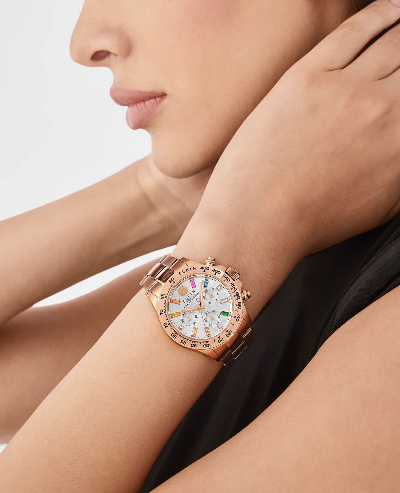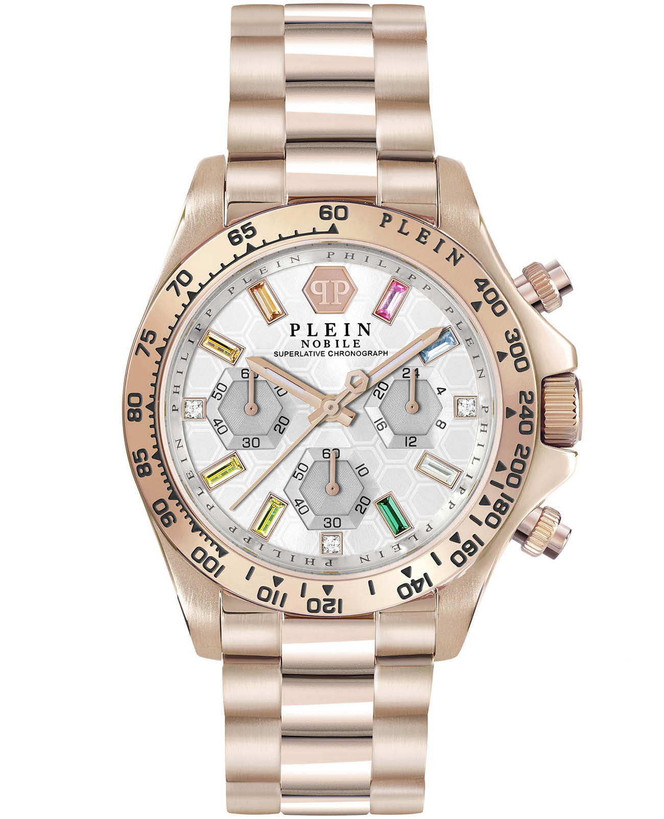 Яркие женские часы-хронографХронографФункция позволяет измерять отрезки времени с особой точностью: часы, минуты, секунды. Верным признаком хронографа является наличие на циферблате 3 дополнительных окошек-счётчиков. с секундомеромСекундомерСекундоме́р — прибор, способный измерять интервалы времени с точностью до долей секунды. Philipp Plein Nobile Lady PWSBA0323, кварцевый механизм с высокой точностью. 12 и 24-часовой формат времени. Класс водозащиты: 50 метров, позволит защитить корпус от случайных брызг или капель дождя. Корпус и браслет часов изготовлены из стали с IP-покрытиемIP-покрытиеМетод ионного напыления. Демонстрирует повышенную устойчивость к истиранию, окислению и химическим веществам. Под воздействием высокого давления и температуры около 1500°C молекулы металла надёжно соединяются с частицами корпуса часов.. Стрелки с люминесцентным покрытиемЛюминесцентное покрытиеПозволяет считывать показания времени в темноте. Производители наносят на стрелки, часовые индексы, безель или поверхность циферблата светонакопительный состав, дающий холодное свечение.. Стальной браслет на застёжке-бабочке с кнопкамиЗастёжка "бабочка"Такой вид застёжки дополняется предохранителями, помогающими избежать случайного раскрытия браслета. Обладают изящным исполнением. . Циферблат инкрустирован кристаллами Preciosa.