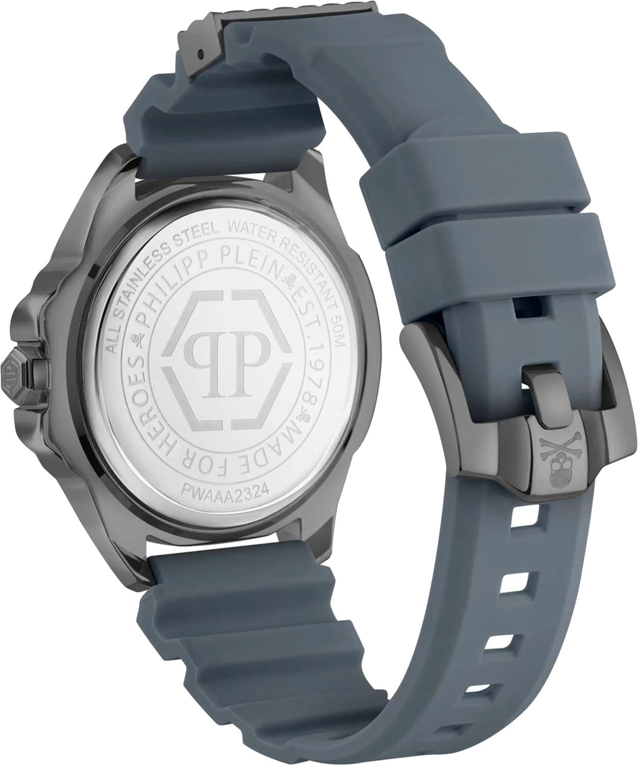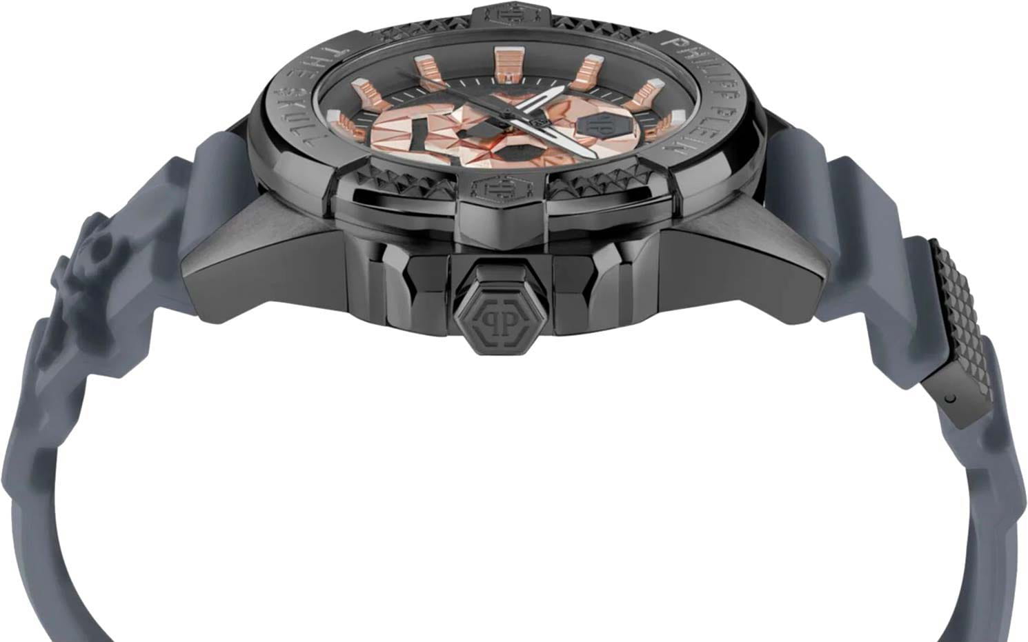 Эти необычные часы, воплощающие в себе уникальное сочетание узнаваемости бренда и непредсказуемости, каждый день будут напоминать вам о том, что нет таких целей, которых вы не смогли бы достичь. Мужские часы с японским кварцевым механизмом. Круглый стальной корпус с серым IP-покрытиемIP-покрытиеМетод ионного напыления. Демонстрирует повышенную устойчивость к истиранию, окислению и химическим веществам. Под воздействием высокого давления и температуры около 1500°C молекулы металла надёжно соединяются с частицами корпуса часов.. БезельБезельВнешний ободок, закрепляющий стекло. В спортивных часах так называется поворотное кольцо с делениями на циферблате, выполняет роль таймера – замеряет отрезки времени на шкале. Неподвижный безель – элемент декора. Однонаправленно вращающийся безель на дайверских часах позволяет фиксировать моменты погружения и выныривания на поверхность. украшен шестиугольными логотипами бренда, расположенными симметрично слева и справа, сверху украшен символичным логотипом Philipp Plein, а снизу украшен названием коллекции ''The Skull''. Гильошированный серый циферблат декорирован шестиугольным логотипом бренда в положении 12 часов и объемным черепом в цвете розовое золото. Метки в виде штрихов. Высокопрочное минеральное стеклоМинеральное стеклоМинеральное стекло представляет собой искусственно выращенный минерал кварца. Такое стекло отличается особой устойчивостью к повреждениям и царапинам. Уступает по некоторым качествам сапфировому стеклу.. Граненая заводная головка с защитой. Серый силиконовый ремешок с классической застежкой украшен объемным черепом и стальной вставкой. Фирменная дизайнерская упаковка.