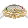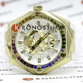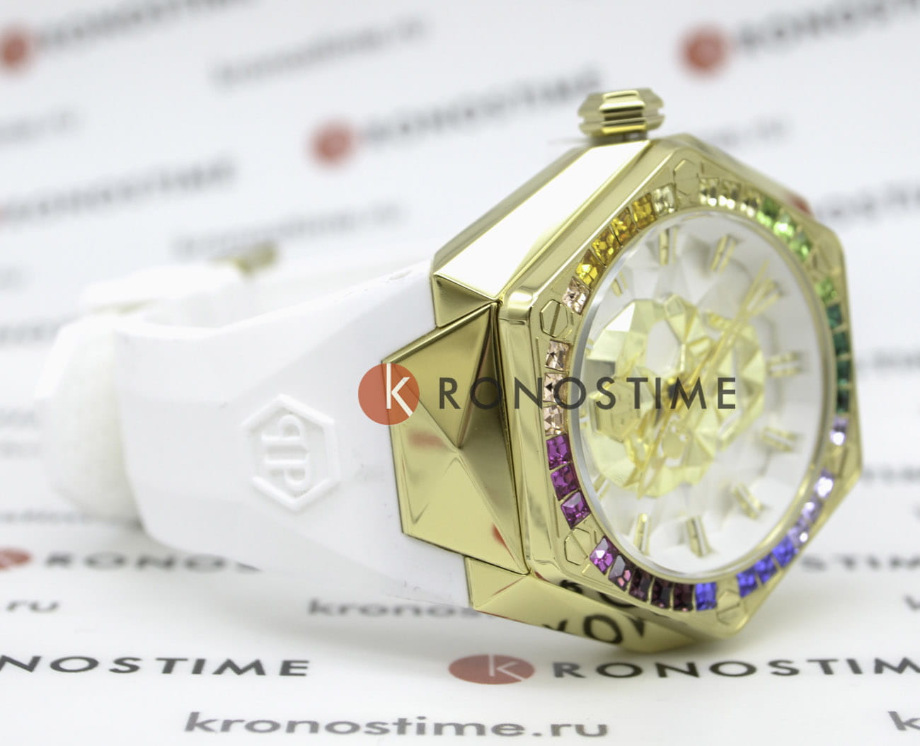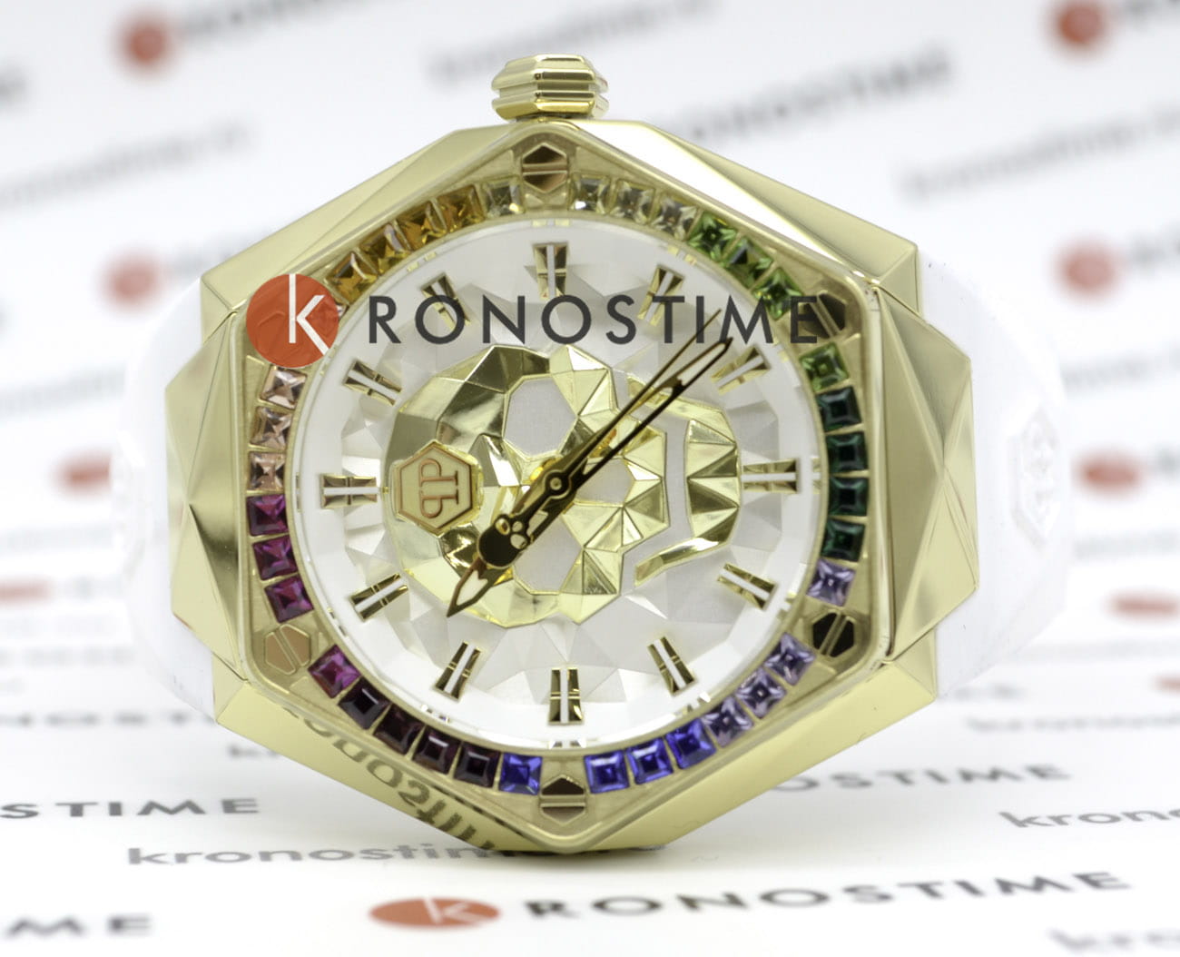 Стальной корпус с золотым IP-покрытиемIP-покрытиеМетод ионного напыления. Демонстрирует повышенную устойчивость к истиранию, окислению и химическим веществам. Под воздействием высокого давления и температуры около 1500°C молекулы металла надёжно соединяются с частицами корпуса часов.. БезельБезельВнешний ободок, закрепляющий стекло. В спортивных часах так называется поворотное кольцо с делениями на циферблате, выполняет роль таймера – замеряет отрезки времени на шкале. Неподвижный безель – элемент декора. Однонаправленно вращающийся безель на дайверских часах позволяет фиксировать моменты погружения и выныривания на поверхность. украшен шестиугольными логотипами бренда, расположенными симметрично слева и справа, сверху украшен символичным логотипом Philipp Plein, а снизу украшен названием коллекции ''The Skull''. Метки в виде штрихов.