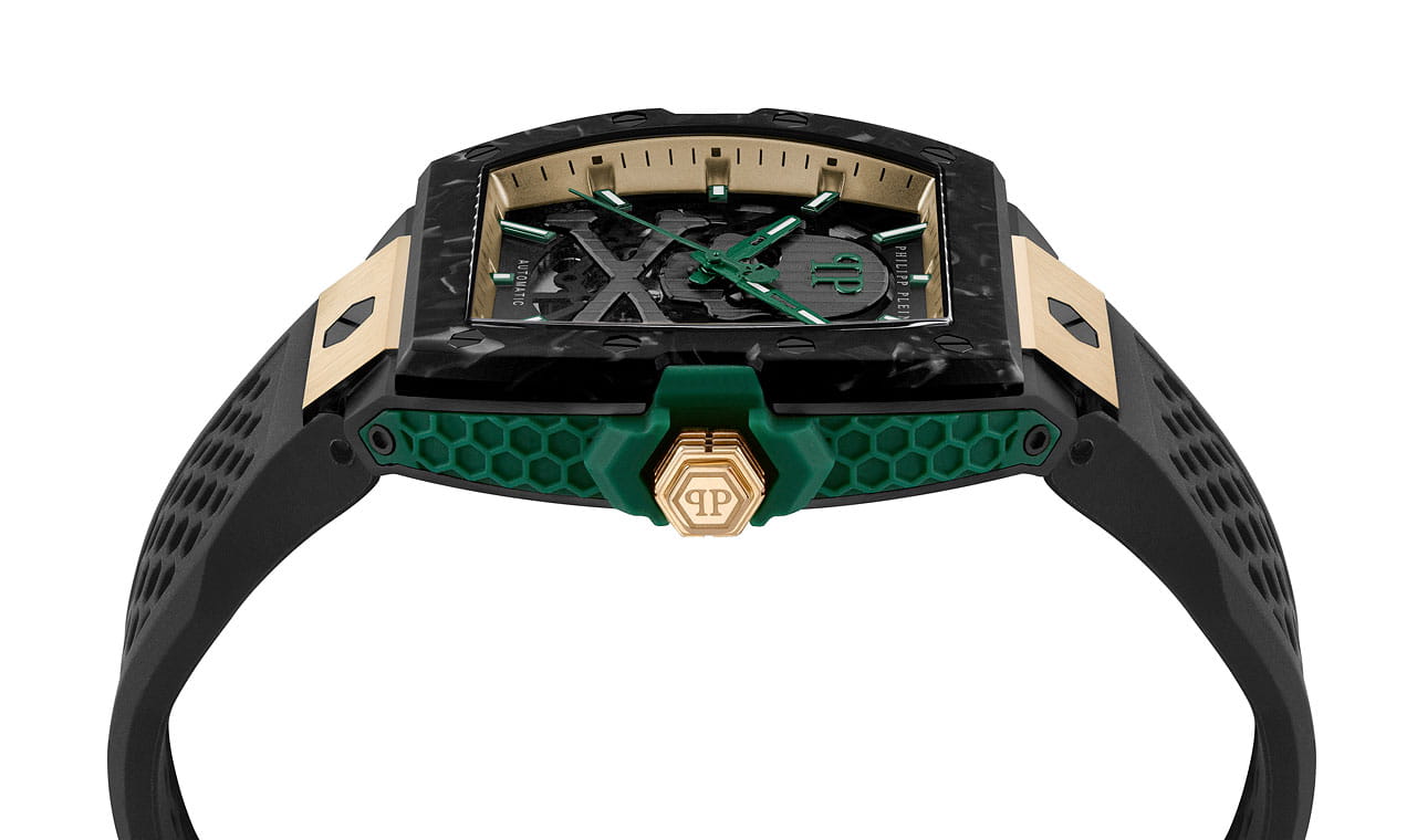 Philipp Plein The $keleton 2.0 PWJFA0325 - это дерзкие и бескомпромиссные часы, воплощающие бунтарский дух бренда. Их отличает узнаваемый мотив черепа, ставший визитной карточкой Philipp Plein, искусно интегрированный в дизайн циферблата. Скелетонизированные мужские механические часы с автоподзаводом. Бочкообразный стальной корпус диаметром 44 мм с PVD-покрытиемPVDУльтратонкое покрытие наносится в технике вакуумного напыления, сочетает в себе нитрид титана особой прочности со слоем золота или оксида хрома. Несёт в себе декоративную или защитную функцию.. Силиконовый ремешок на стандартной застёжке обеспечивает надёжную фиксацию и комфортное ношение. Метки в виде точек. Минеральное стеклоМинеральное стеклоМинеральное стекло представляет собой искусственно выращенный минерал кварца. Такое стекло отличается особой устойчивостью к повреждениям и царапинам. Уступает по некоторым качествам сапфировому стеклу. защищает циферблат от царапин. Люминесцентное покрытиеЛюминесцентное покрытиеПозволяет считывать показания времени в темноте. Производители наносят на стрелки, часовые индексы, безель или поверхность циферблата светонакопительный состав, дающий холодное свечение. стрелок и меток позволит следить за временем даже в полной темноте. Граненая заводная головка. Влагозащита: 50 метров, позволит защитить корпус от случайных брызг или капель дождя. Идеальный аксессуар для тех, кто ценит индивидуальность и не боится выделяться из толпы.