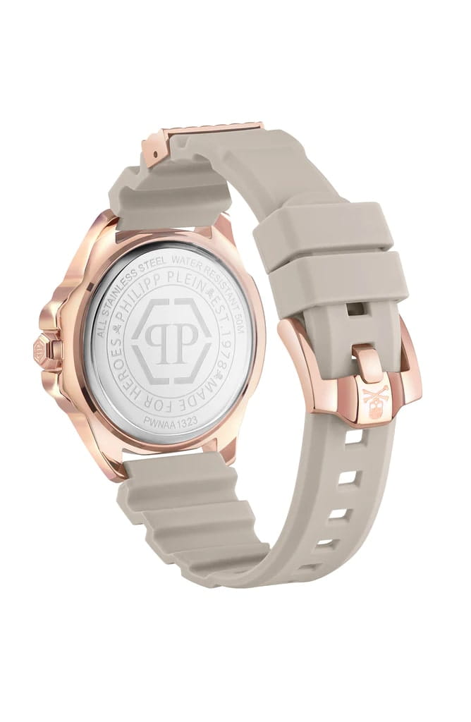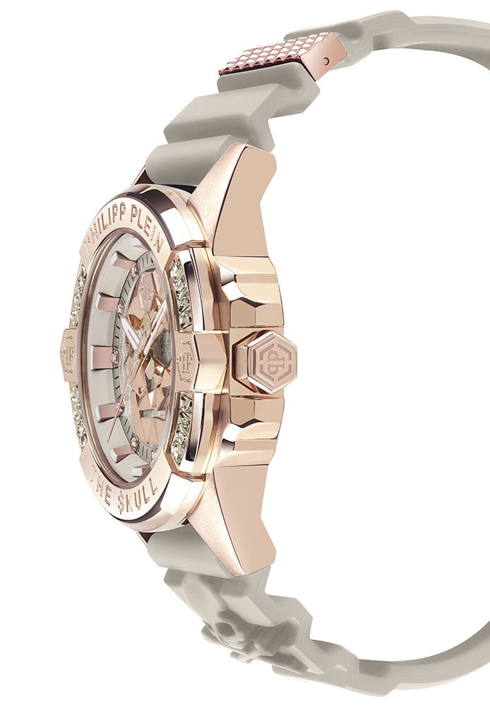 Яркие женские часы с минеральным стекломМинеральное стеклоМинеральное стекло представляет собой искусственно выращенный минерал кварца. Такое стекло отличается особой устойчивостью к повреждениям и царапинам. Уступает по некоторым качествам сапфировому стеклу. Philipp Plein The Skull PWNAA1323, кварцевый механизм с высокой точностью. Класс водозащиты: 50 метров, позволит защитить корпус от случайных брызг или капель дождя. Корпус часов изготовлен из стали с IP-покрытиемIP-покрытиеМетод ионного напыления. Демонстрирует повышенную устойчивость к истиранию, окислению и химическим веществам. Под воздействием высокого давления и температуры около 1500°C молекулы металла надёжно соединяются с частицами корпуса часов.. Круглый стальной корпус украшен кристаллами Swarovski. Циферблат с метками в виде точек украшенных кристаллами Swarovski, дополнен объемным черепом. Шестигранная заводная головка с защитой. Силиконовый ремешок украшен объемным черепом.