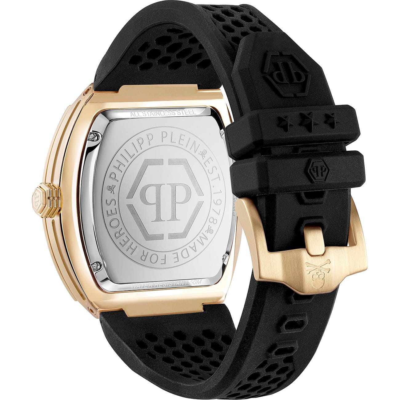 Стильные женские часы Philipp Plein PWPUA0424 с надежным кварцевым механизмом. Корпус часов изготовлен из нержавеющей стали с IP-покрытиемIP-покрытиеМетод ионного напыления. Демонстрирует повышенную устойчивость к истиранию, окислению и химическим веществам. Под воздействием высокого давления и температуры около 1500°C молекулы металла надёжно соединяются с частицами корпуса часов.. Минеральное стеклоМинеральное стеклоМинеральное стекло представляет собой искусственно выращенный минерал кварца. Такое стекло отличается особой устойчивостью к повреждениям и царапинам. Уступает по некоторым качествам сапфировому стеклу. устойчивое к мелким механическим повреждениям. Влагозащита: 50 метров, позволит защитить корпус от случайных брызг или капель дождя. Стрелки и метки с люминесцентным покрытиемЛюминесцентное покрытиеПозволяет считывать показания времени в темноте. Производители наносят на стрелки, часовые индексы, безель или поверхность циферблата светонакопительный состав, дающий холодное свечение.. Окошко даты находится в положении 6 часов.
