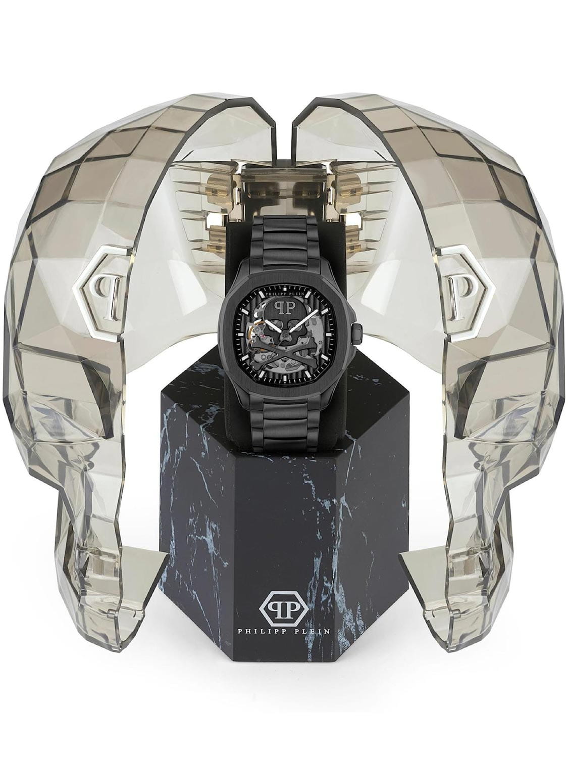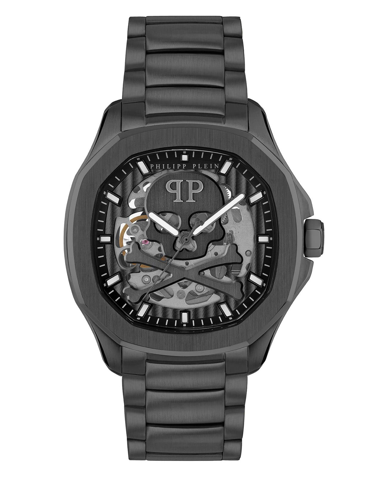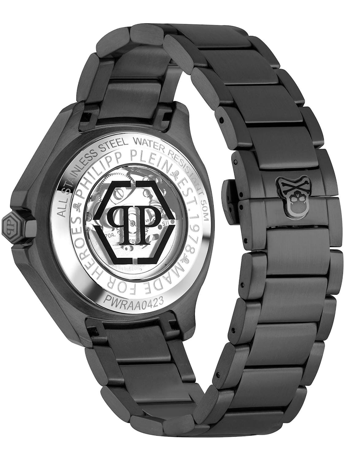 Яркие мужские часы с минеральным стекломМинеральное стеклоМинеральное стекло представляет собой искусственно выращенный минерал кварца. Такое стекло отличается особой устойчивостью к повреждениям и царапинам. Уступает по некоторым качествам сапфировому стеклу. Philipp Plein PWRAA0423, механический механизм с автоподзаводом.  Класс водозащиты: 50 метров, позволит защитить корпус от случайных брызг или капель дождя. Корпус часов изготовлен из стали с IP-покрытиемIP-покрытиеМетод ионного напыления. Демонстрирует повышенную устойчивость к истиранию, окислению и химическим веществам. Под воздействием высокого давления и температуры около 1500°C молекулы металла надёжно соединяются с частицами корпуса часов.. Стрелки и метки с люминесцентным покрытиемЛюминесцентное покрытиеПозволяет считывать показания времени в темноте. Производители наносят на стрелки, часовые индексы, безель или поверхность циферблата светонакопительный состав, дающий холодное свечение.. Скелетонизированные. Часы с механизмом, из которого удалён весь «лишний» металл, с прозрачными циферблатом и задней крышкой. Застёжка бабочка с кнопкамиЗастёжка "бабочка"Такой вид застёжки дополняется предохранителями, помогающими избежать случайного раскрытия браслета. Обладают изящным исполнением.