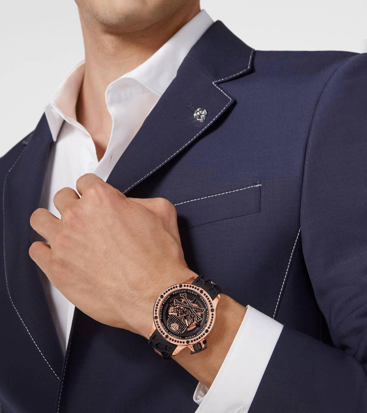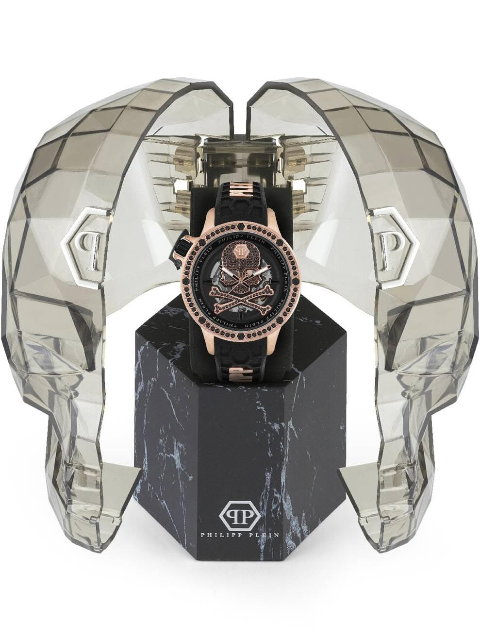Яркие мужские часы с минеральным стекломМинеральное стеклоМинеральное стекло представляет собой искусственно выращенный минерал кварца. Такое стекло отличается особой устойчивостью к повреждениям и царапинам. Уступает по некоторым качествам сапфировому стеклу. Philipp Plein PWUAA0323, механический механизм с автоподзаводом. Класс водозащиты: 50 метров, позволит защитить корпус от случайных брызг или капель дождя. Корпус часов изготовлен из стали с IP-покрытиемIP-покрытиеМетод ионного напыления. Демонстрирует повышенную устойчивость к истиранию, окислению и химическим веществам. Под воздействием высокого давления и температуры около 1500°C молекулы металла надёжно соединяются с частицами корпуса часов. и украшен кристаллами. Стрелки и метки с люминесцентным покрытиемЛюминесцентное покрытиеПозволяет считывать показания времени в темноте. Производители наносят на стрелки, часовые индексы, безель или поверхность циферблата светонакопительный состав, дающий холодное свечение..